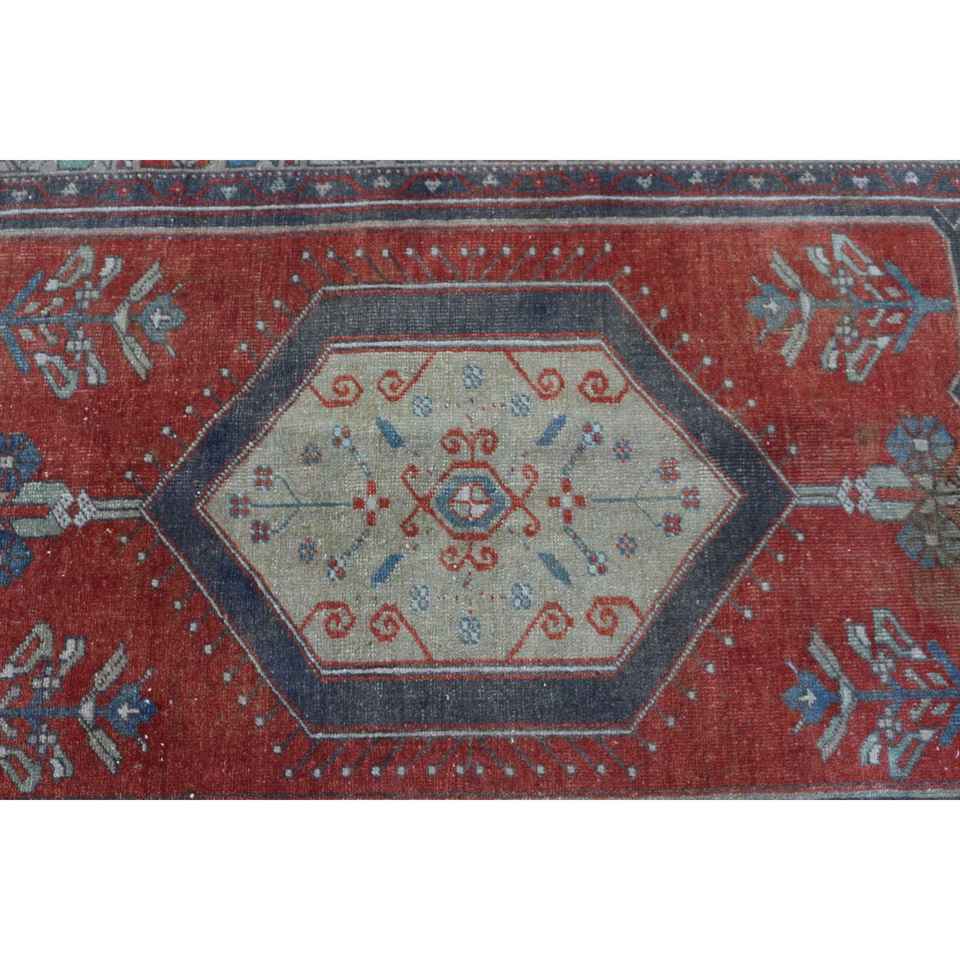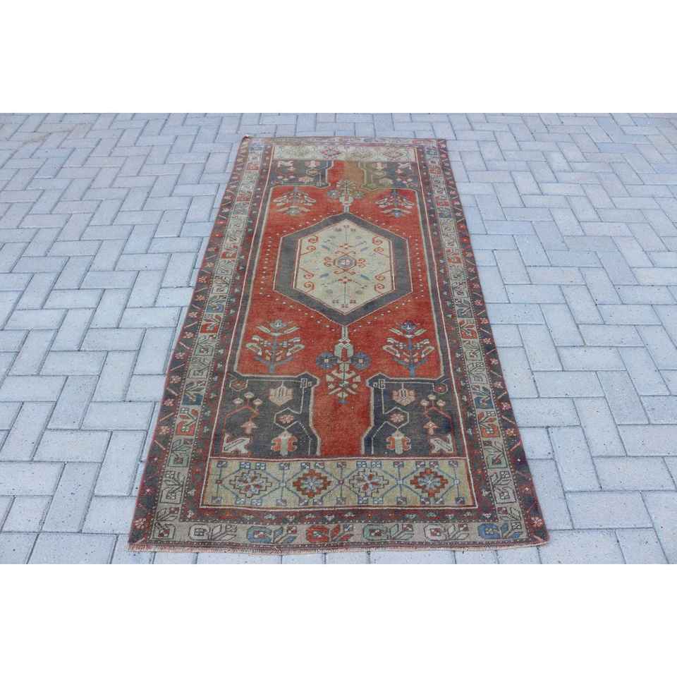 Alfombra Turca Vintage, Alfombra Decorativa de 3.3x6.8 pies, Alfombra con Diseño de Parches Rojos y Azules