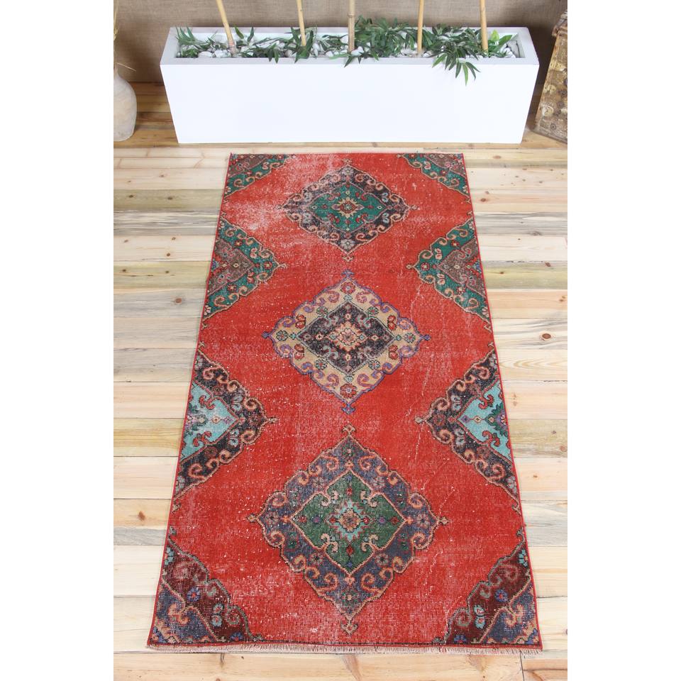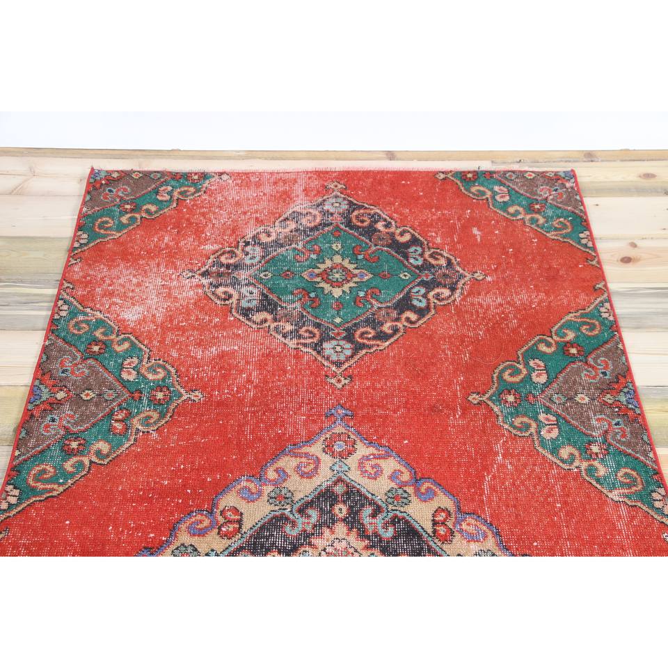 Alfombra Turca Vintage de 3.4x6.9 pies (105x210 cm), Alfombra Roja con Diseño Floral Verde