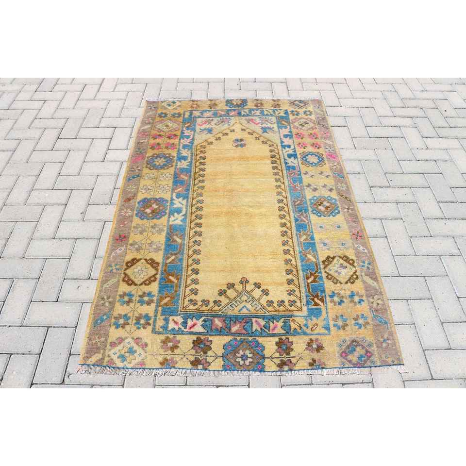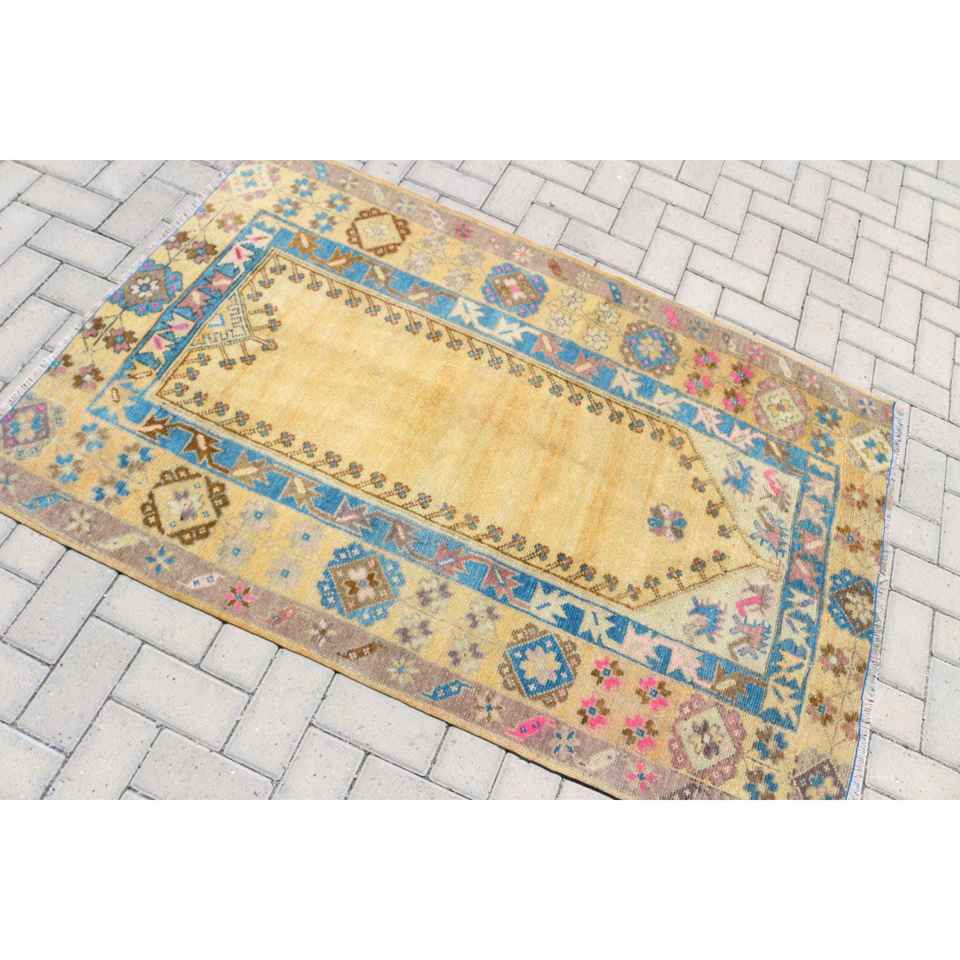 Alfombra Turca Vintage, Alfombra de 3.5x5.4 pies, Alfombra de Lana con Rayas Amarillas y Azules