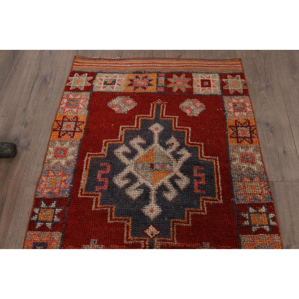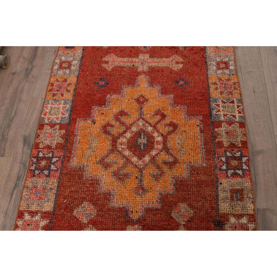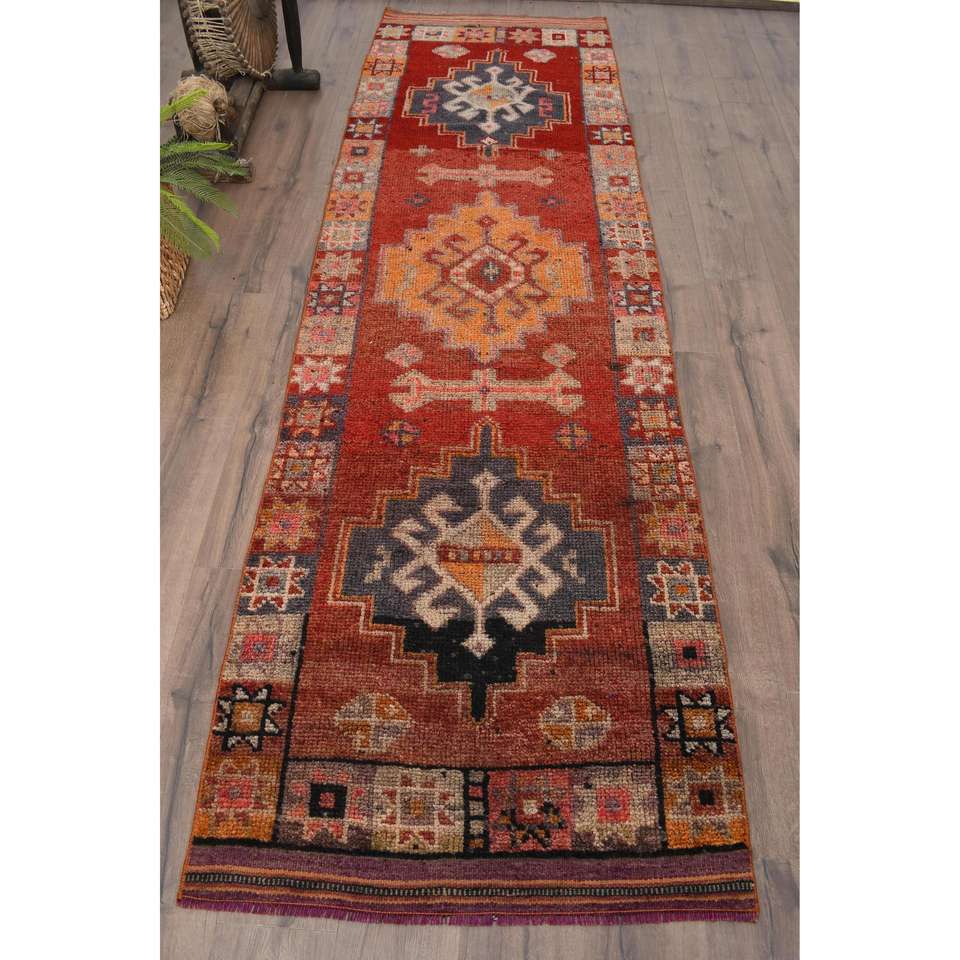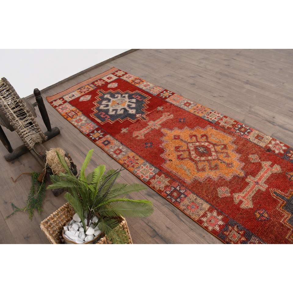 Alfombra Turca Vintage, Alfombra de Pasillo de 3x10.7 pies, Alfombra con Diseño de Plantas y Árboles Rojo Anaranjado