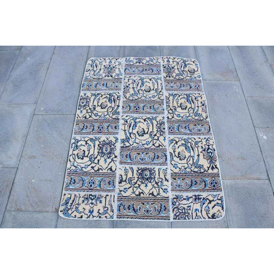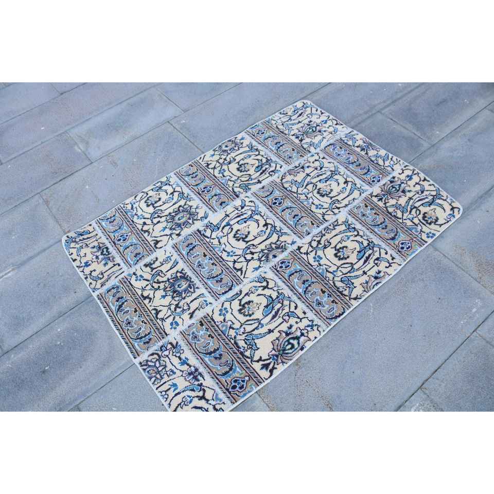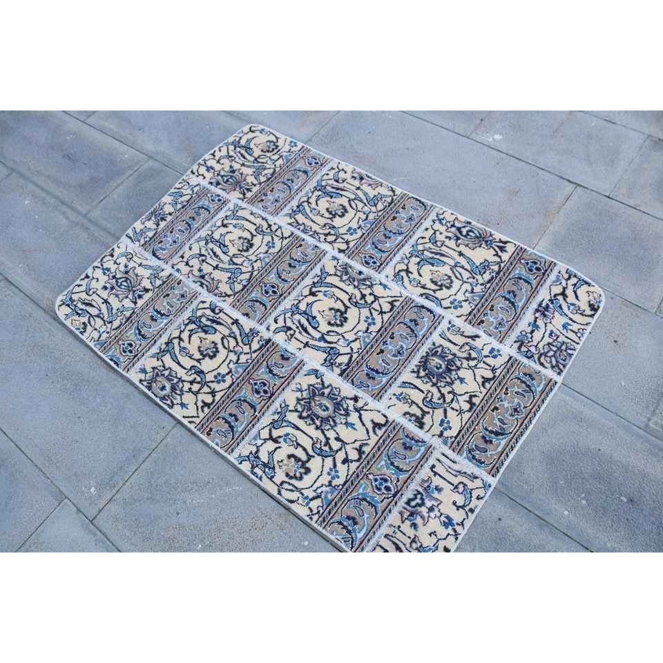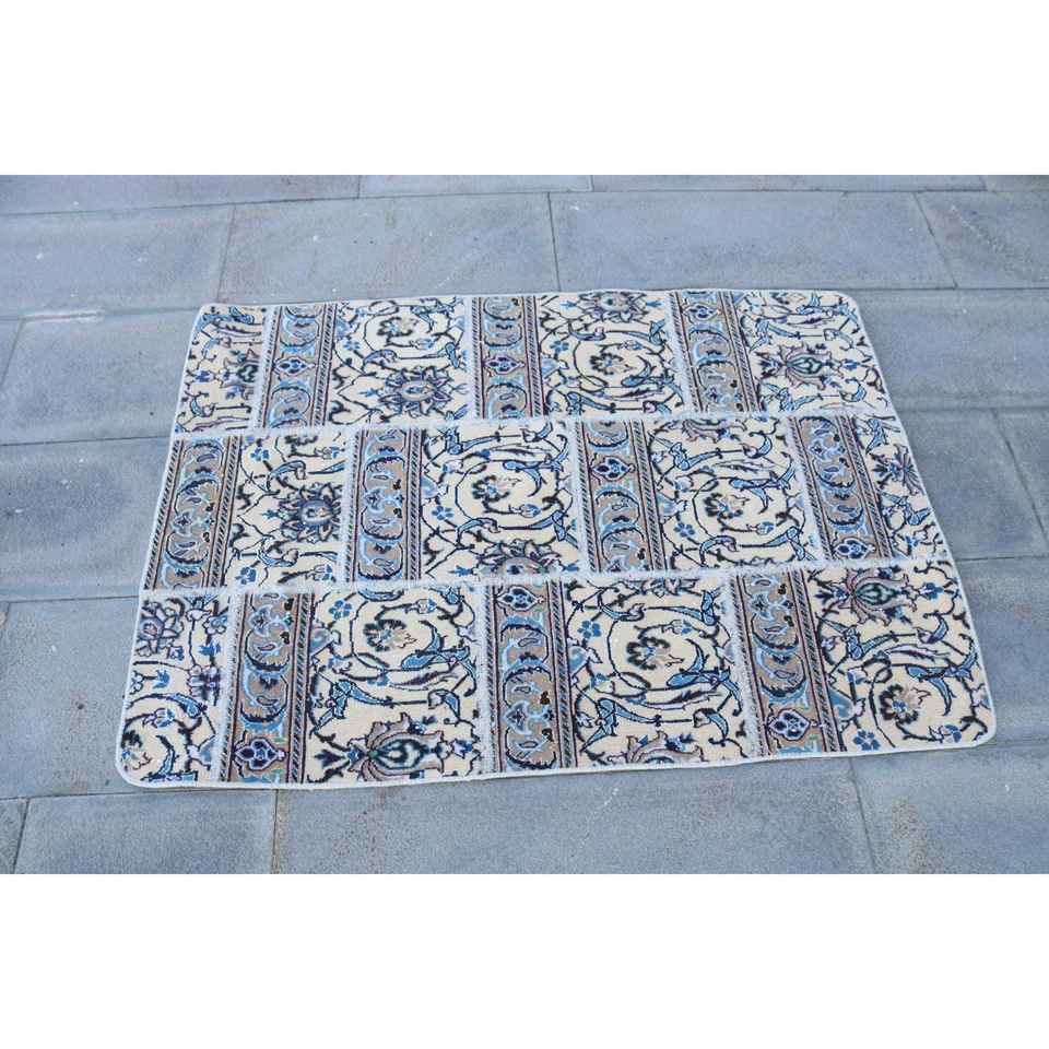 Alfombra Turca Vintage, Alfombra Pequeña de 3x4.1 pies, Alfombra de Lana con Estampado Animal Azul y Blanco