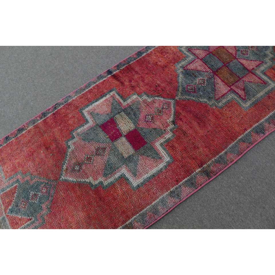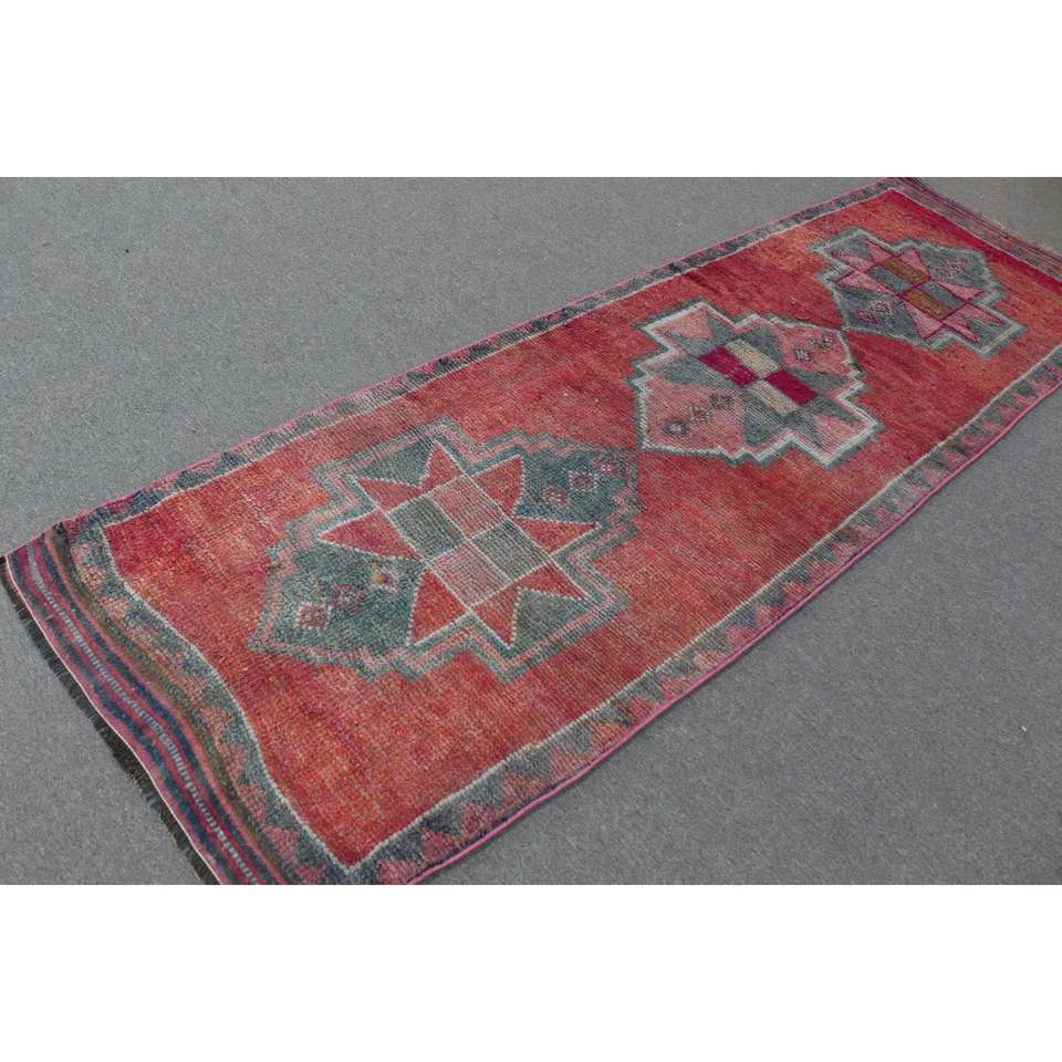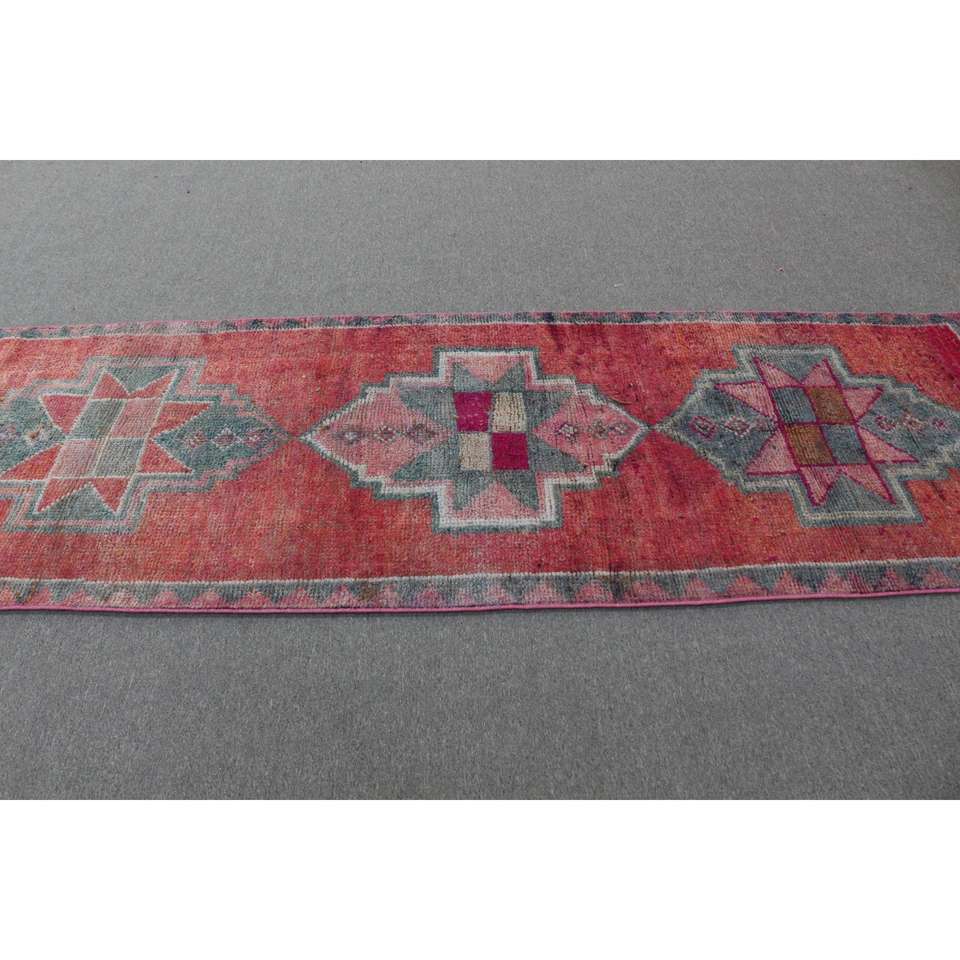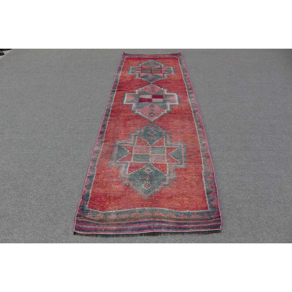 Alfombra Turca Vintage de Lana 3x9.9 pies, Alfombra Persa Herki Roja con Diseño de Patchwork y Respaldo de Látex