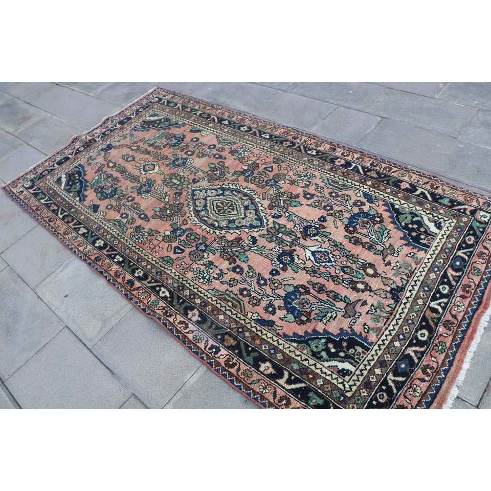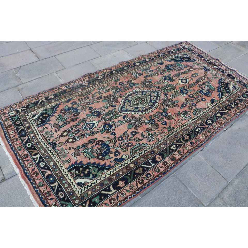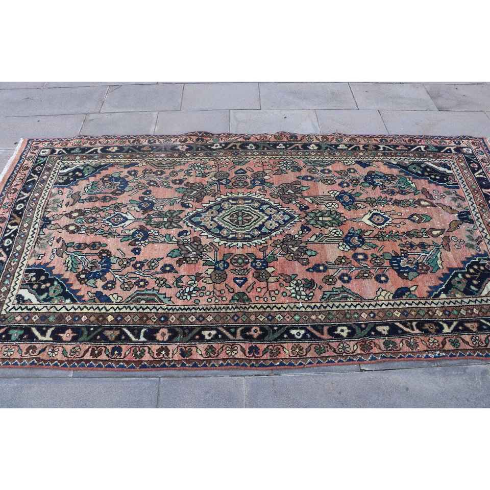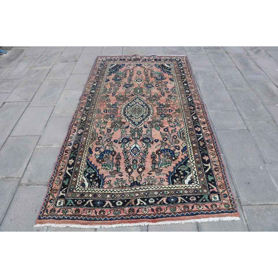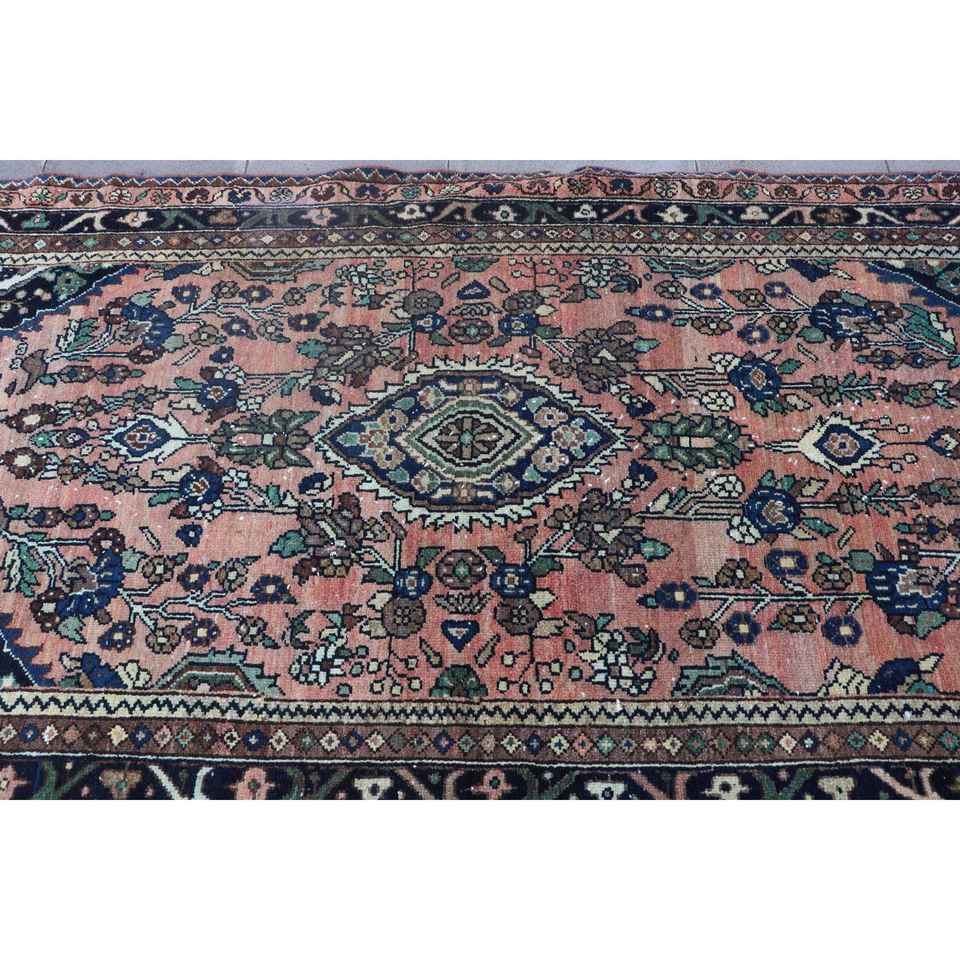 Alfombra Turca Vintage de 4.1x7.7 pies (125x236 cm), Alfombra Floral Azul y Roja