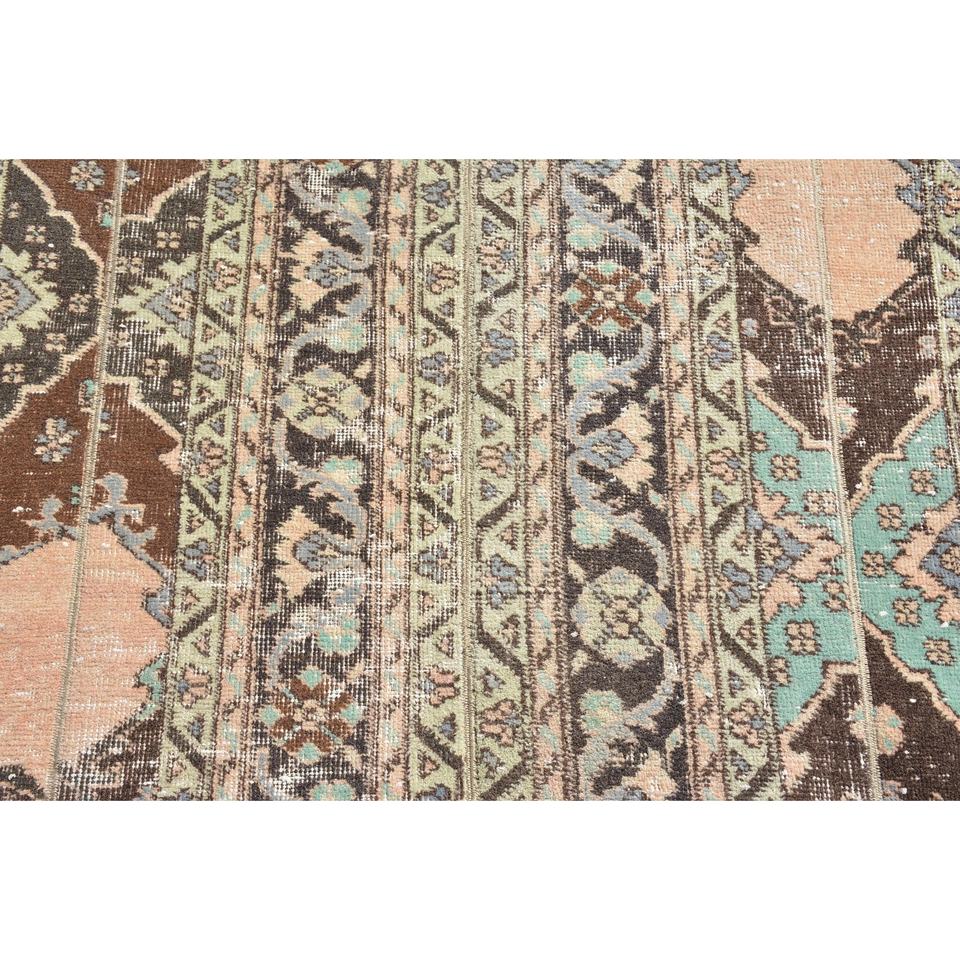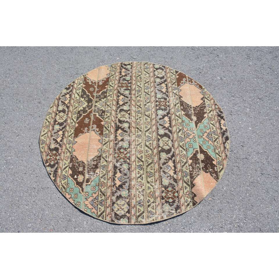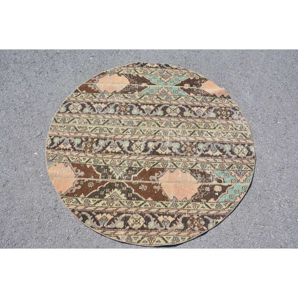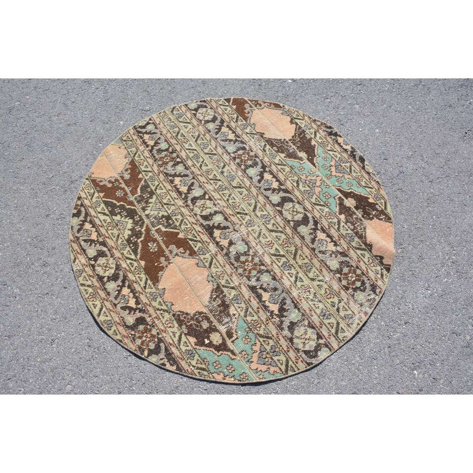 Alfombra Turca Vintage, Redonda de 4.2x4.2 pies, Alfombra de Lana a Cuadros Marrón y Azul