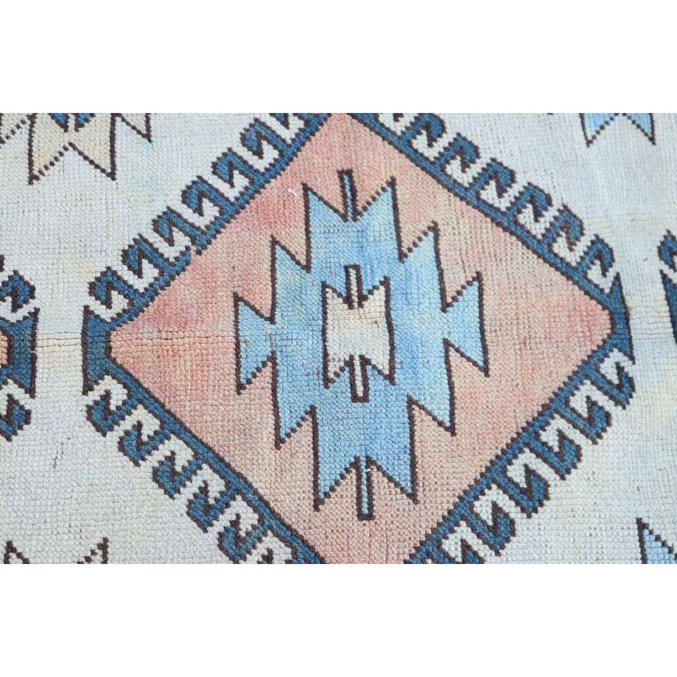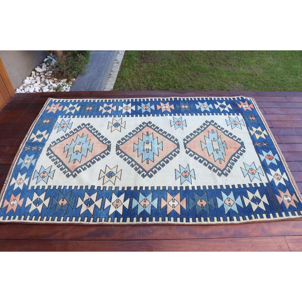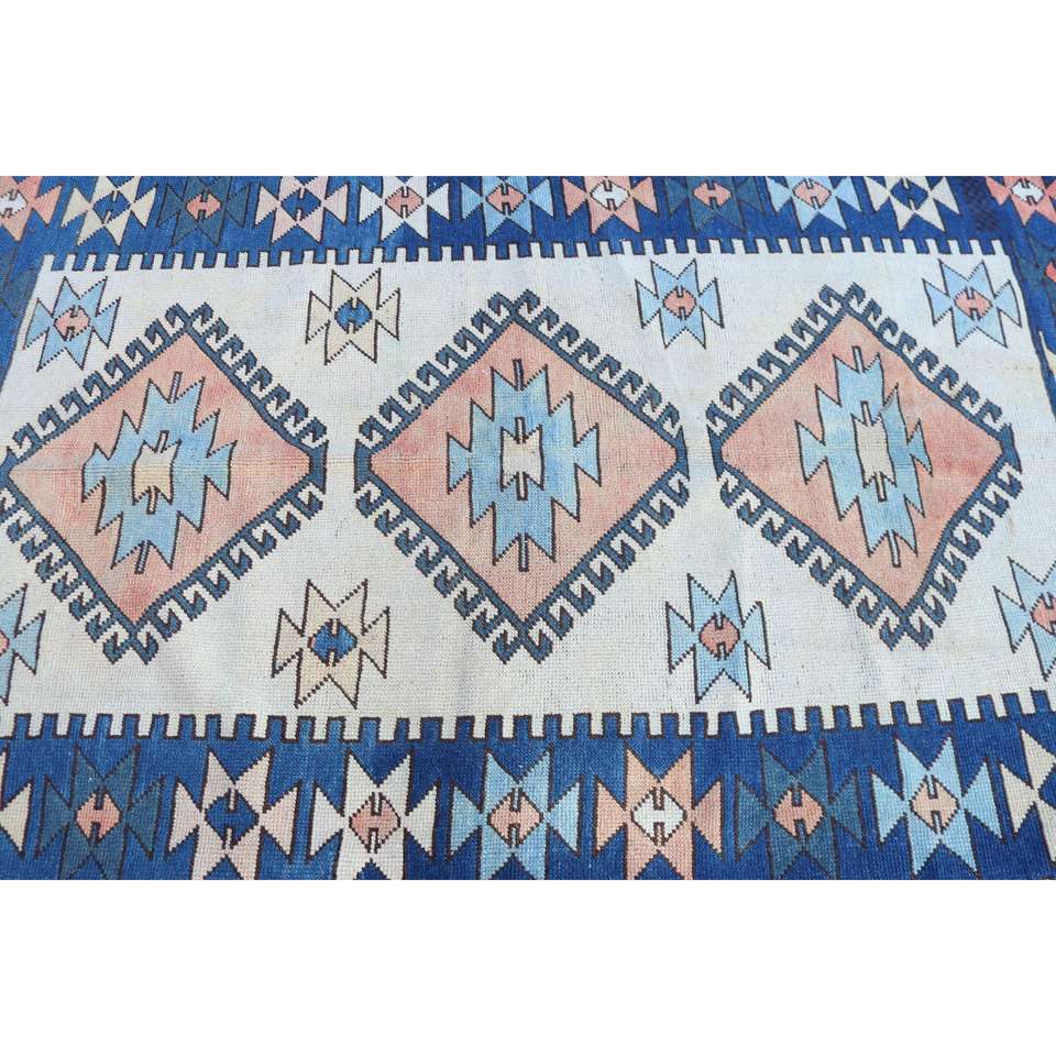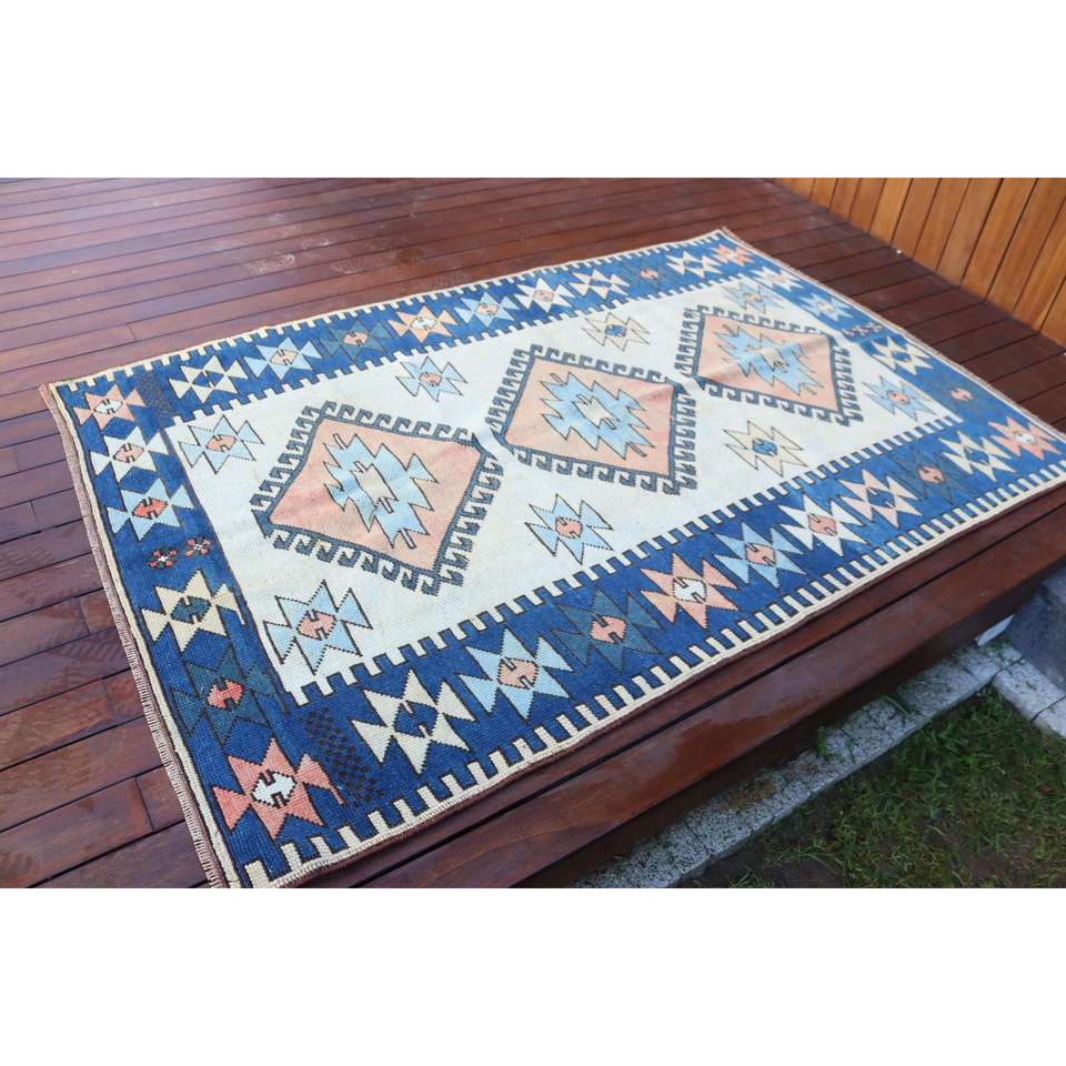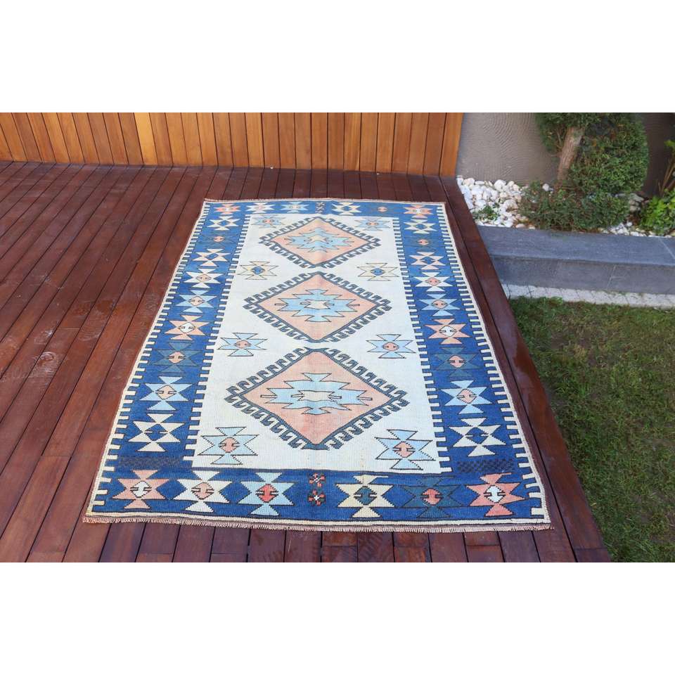 Alfombra Turca Vintage, Alfombra de Lana Persa Azul y Blanca de 4.2x6.3 pies