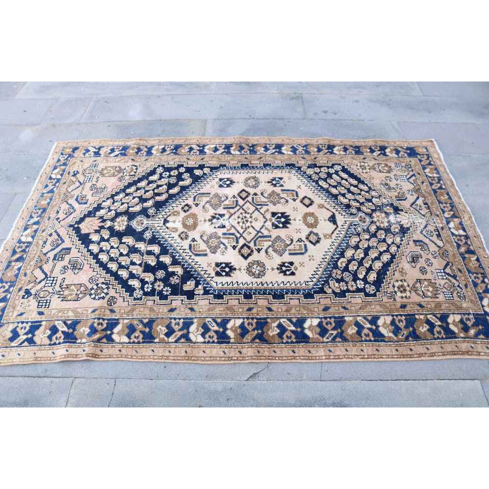 Alfombra Turca Vintage, Alfombra de 4.2x6.46 pies, Alfombra con Borde Azul