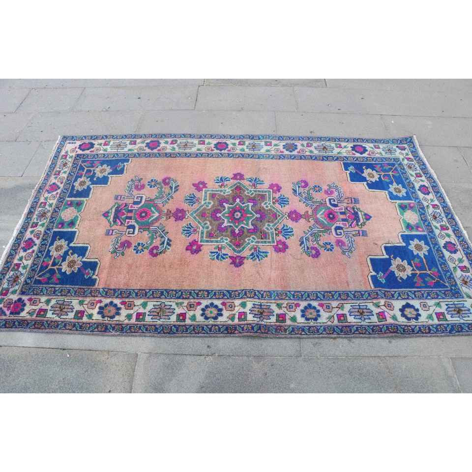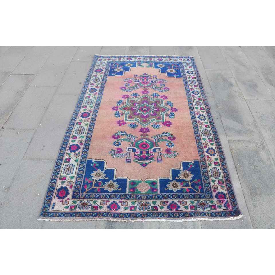 Alfombra Turca Vintage de 4.2x6.46 pies (127x197 cm), Alfombra Floral Azul y Rosa