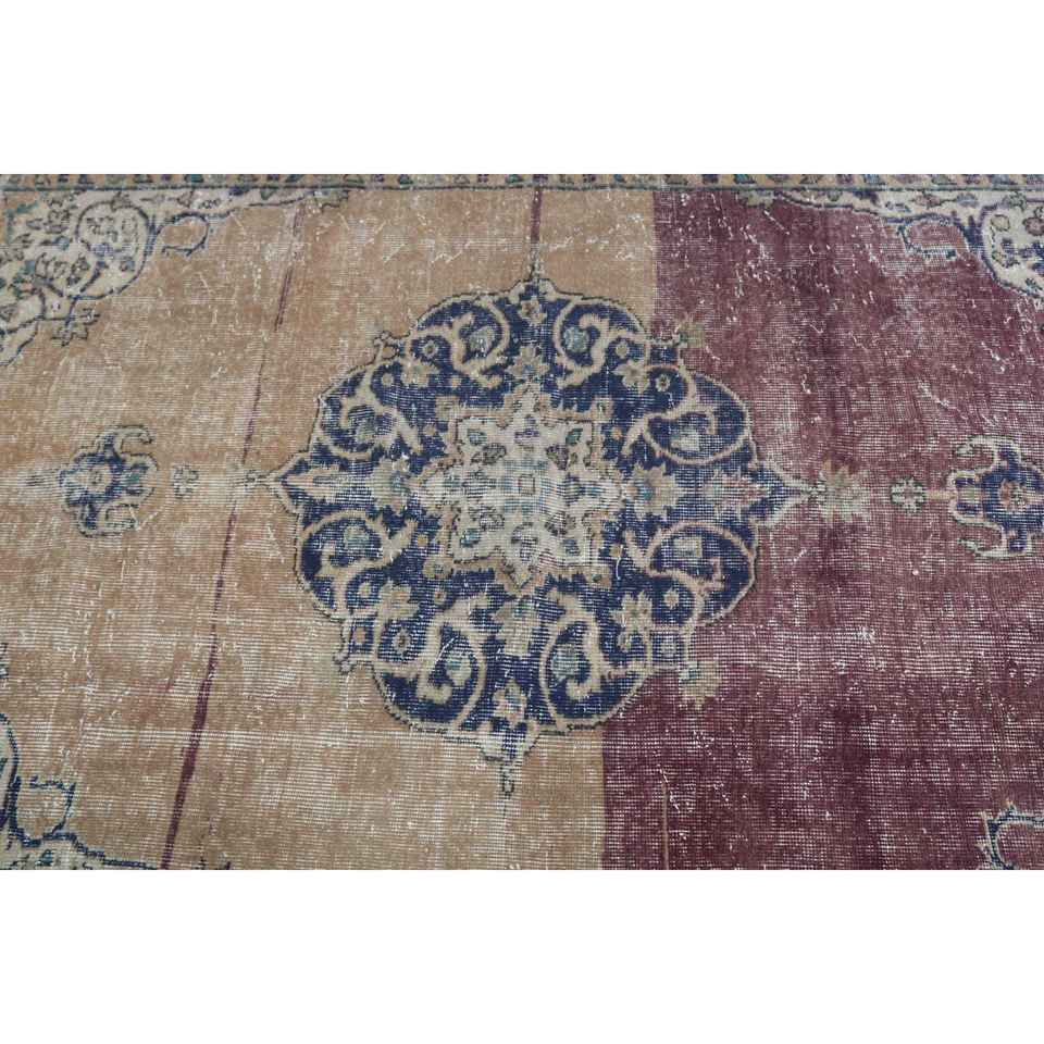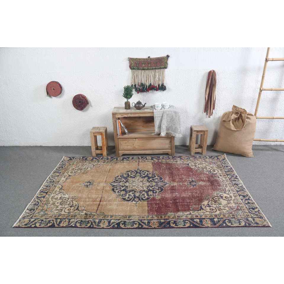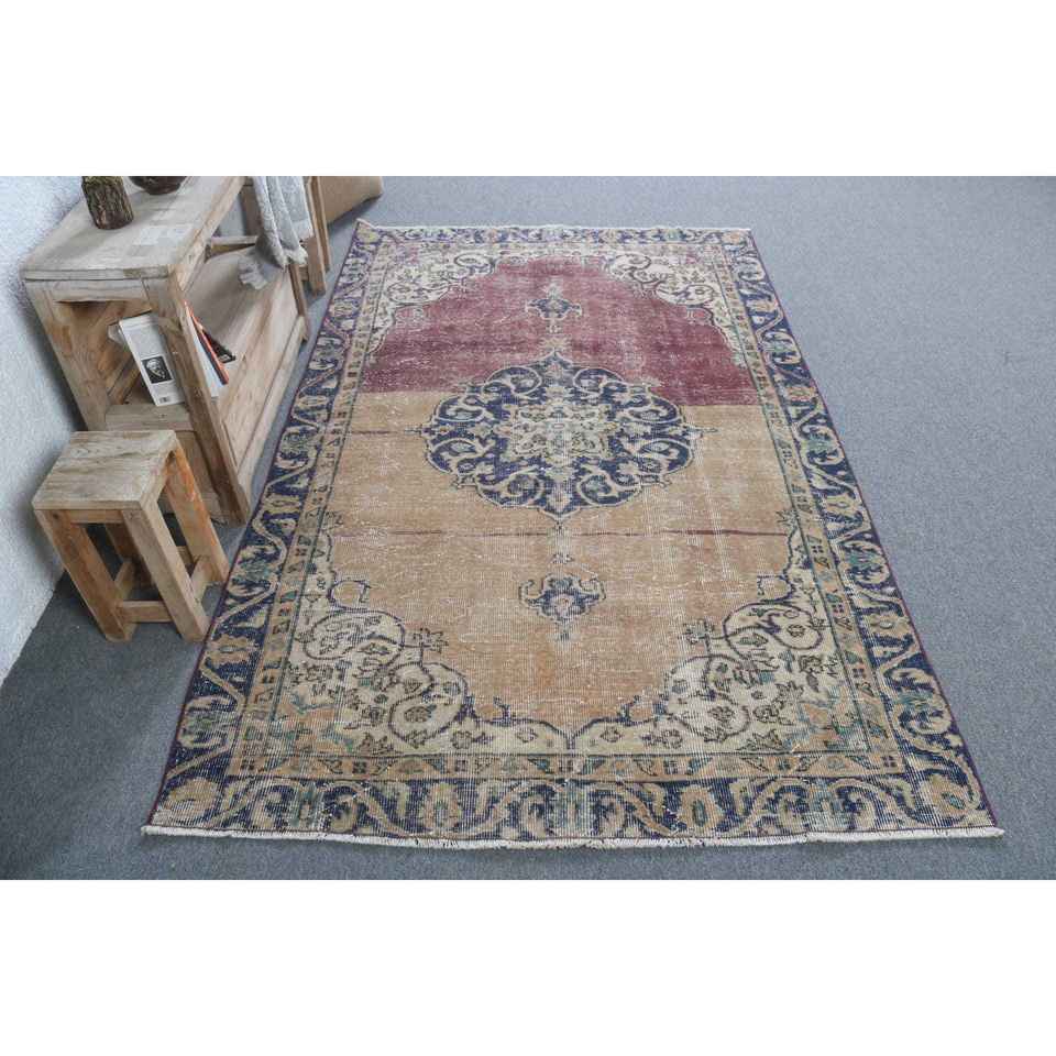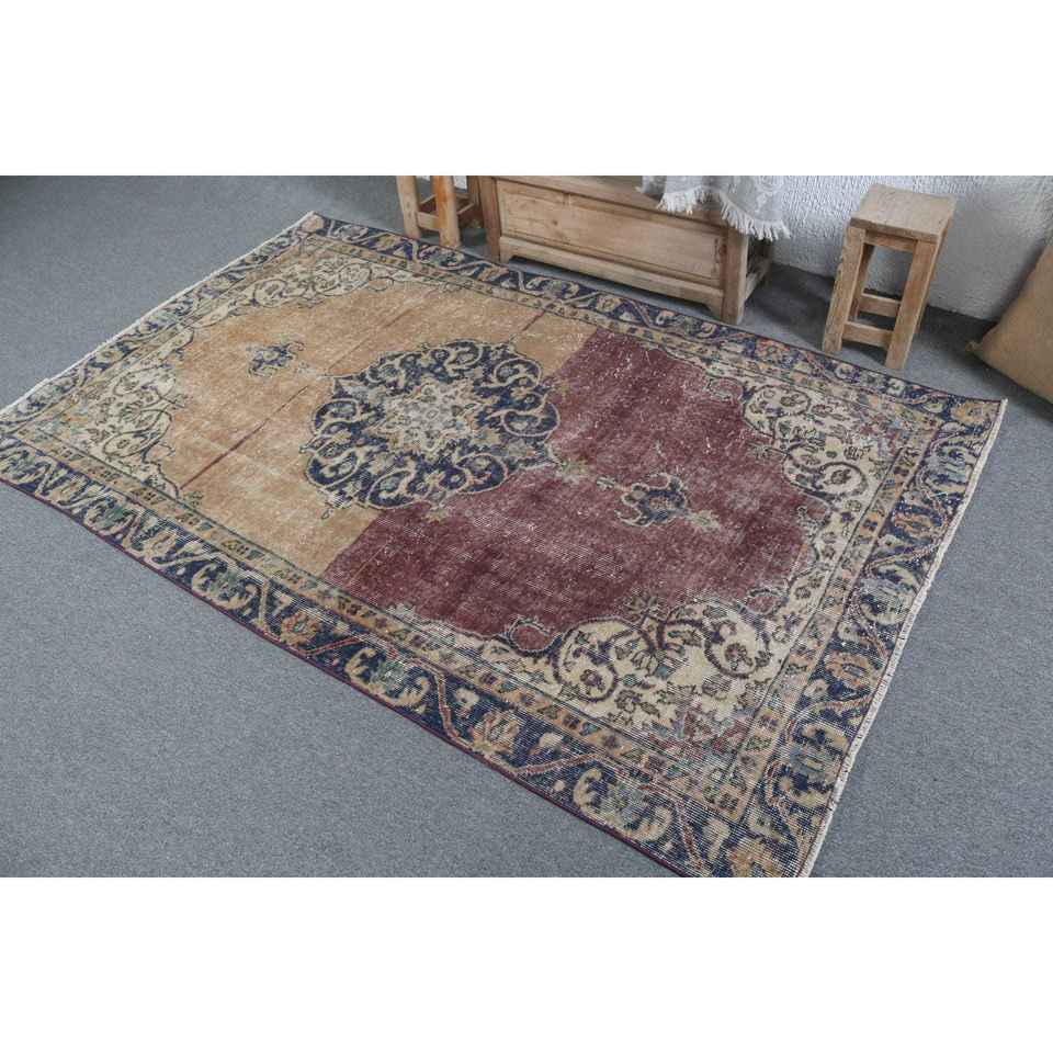 Alfombra Turca Vintage de 4.5x7.2 pies (137x219 cm), Alfombra a Cuadros Azul y Roja
