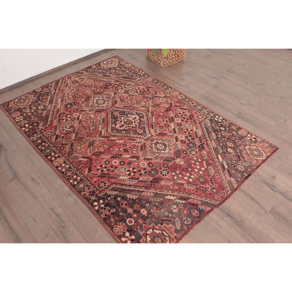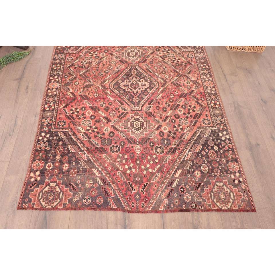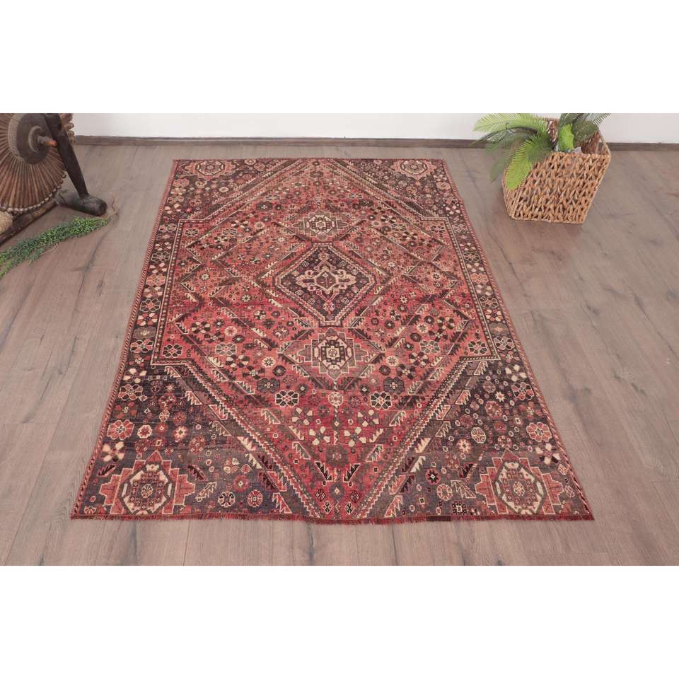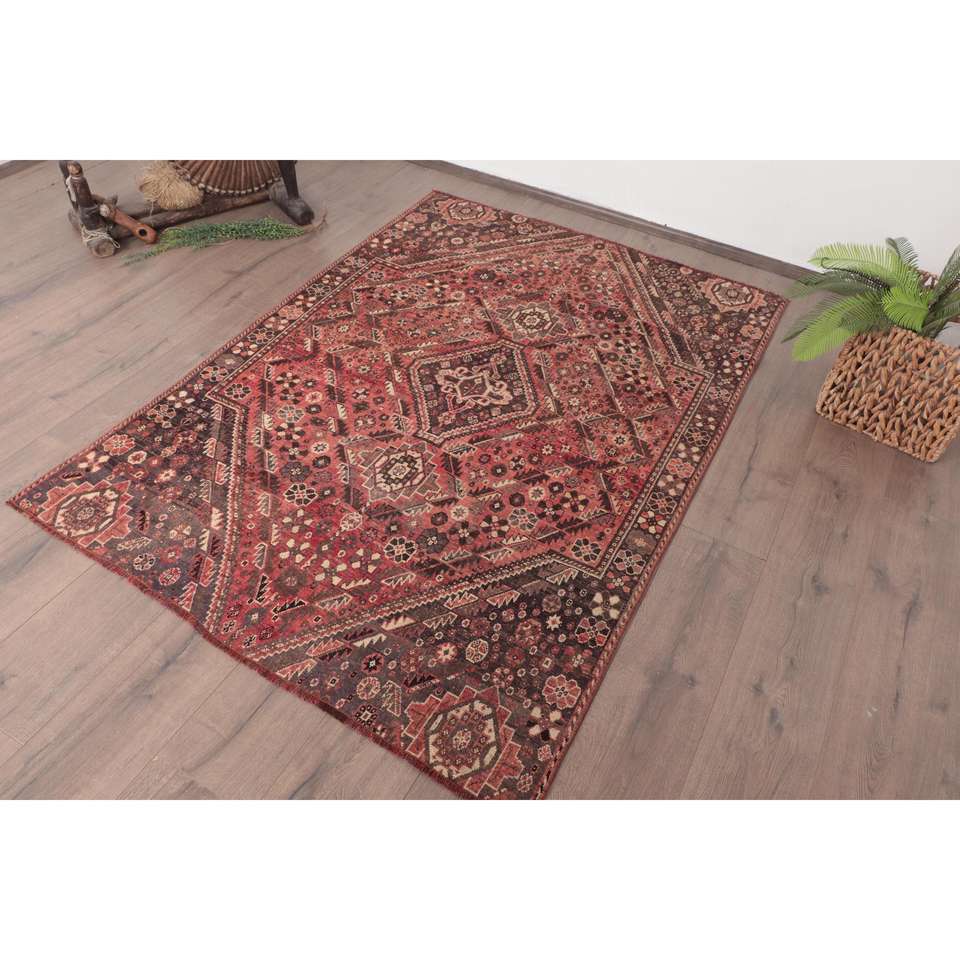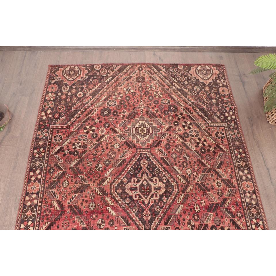 Alfombra Turca Vintage de 4x5.8 pies, Alfombra de Lana con Rayas Rojas