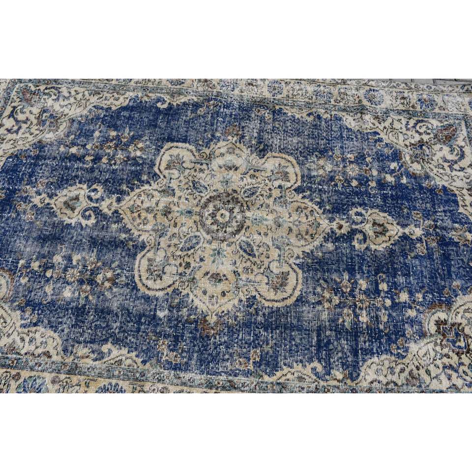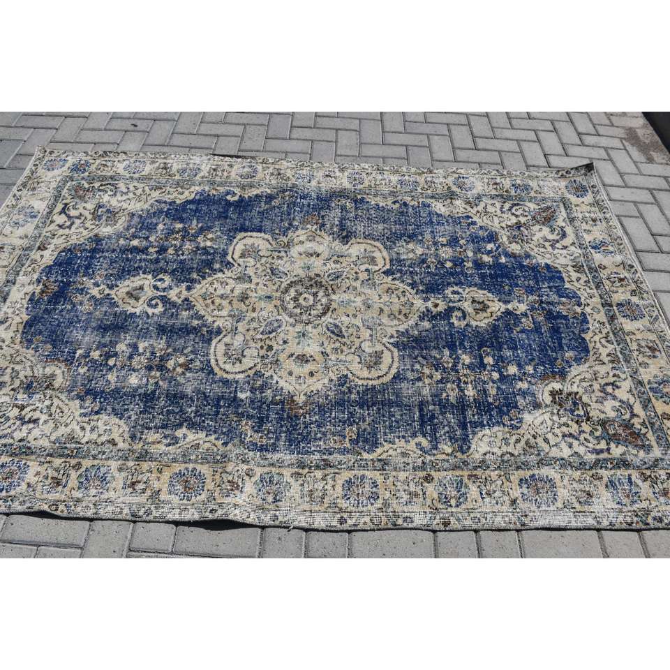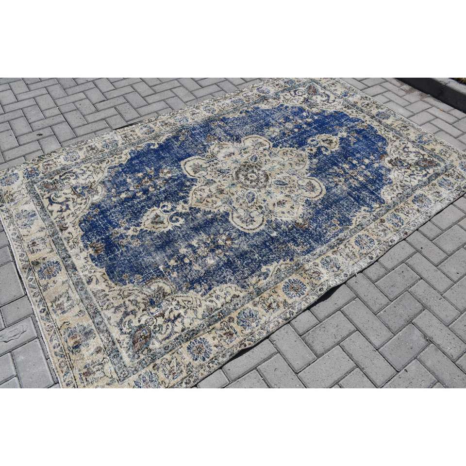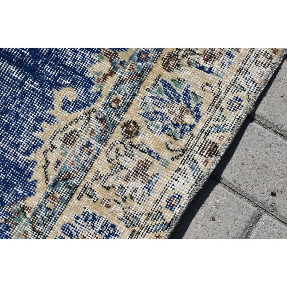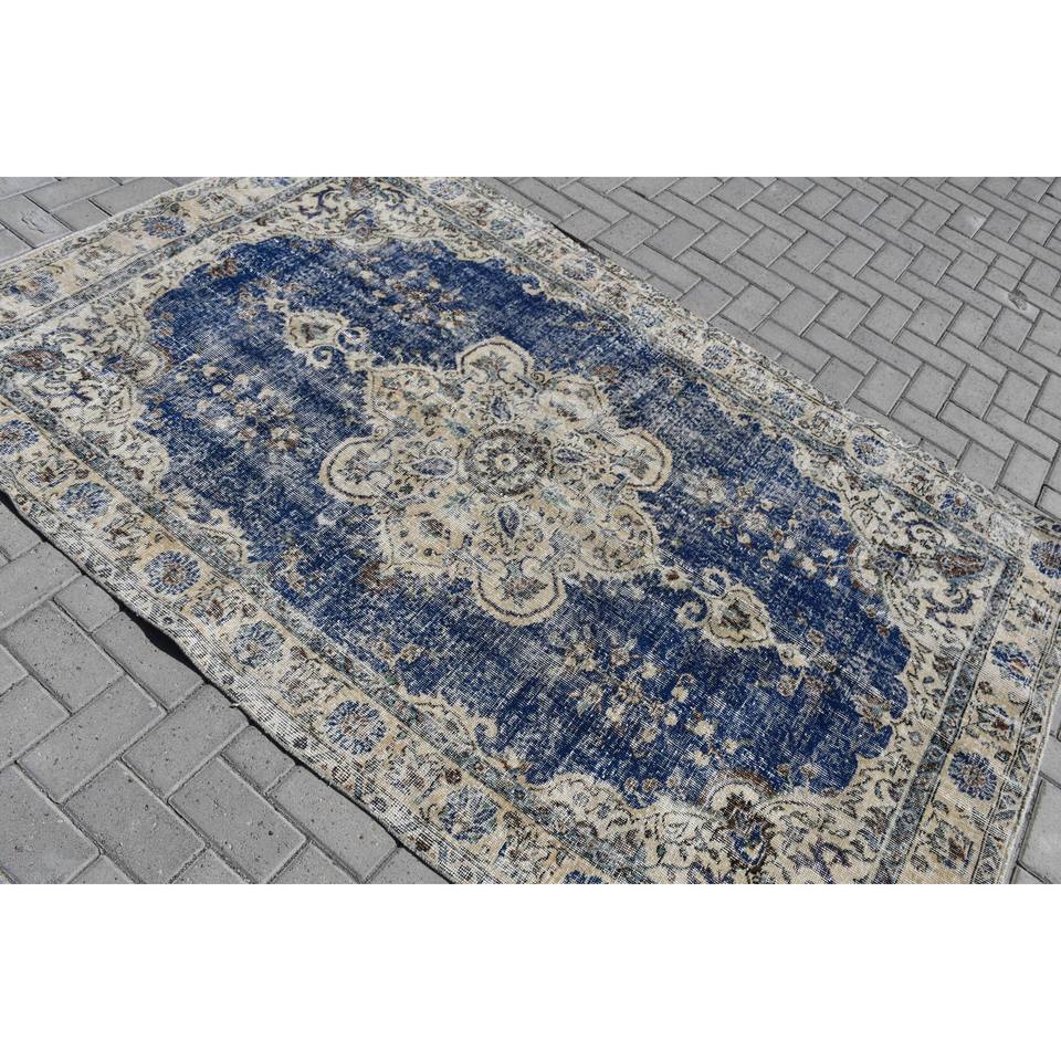 Alfombra Turca Vintage, Alfombra de 5x7.6 pies, Alfombra Azul Ikat