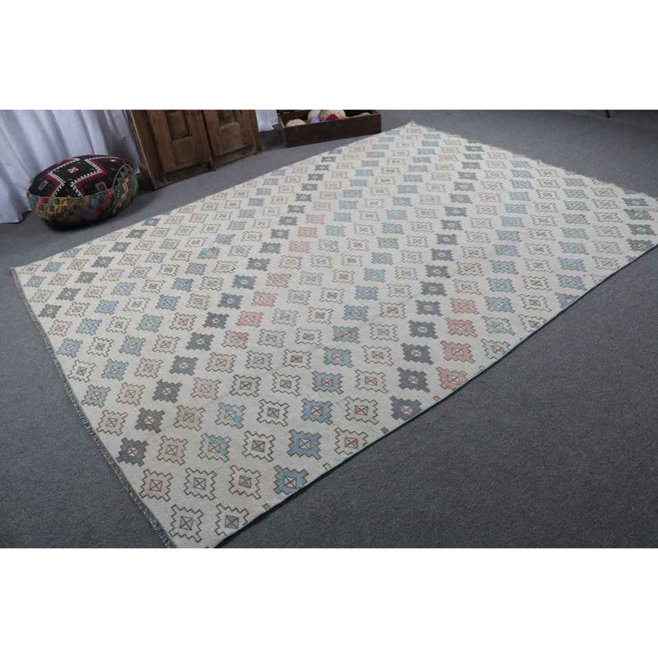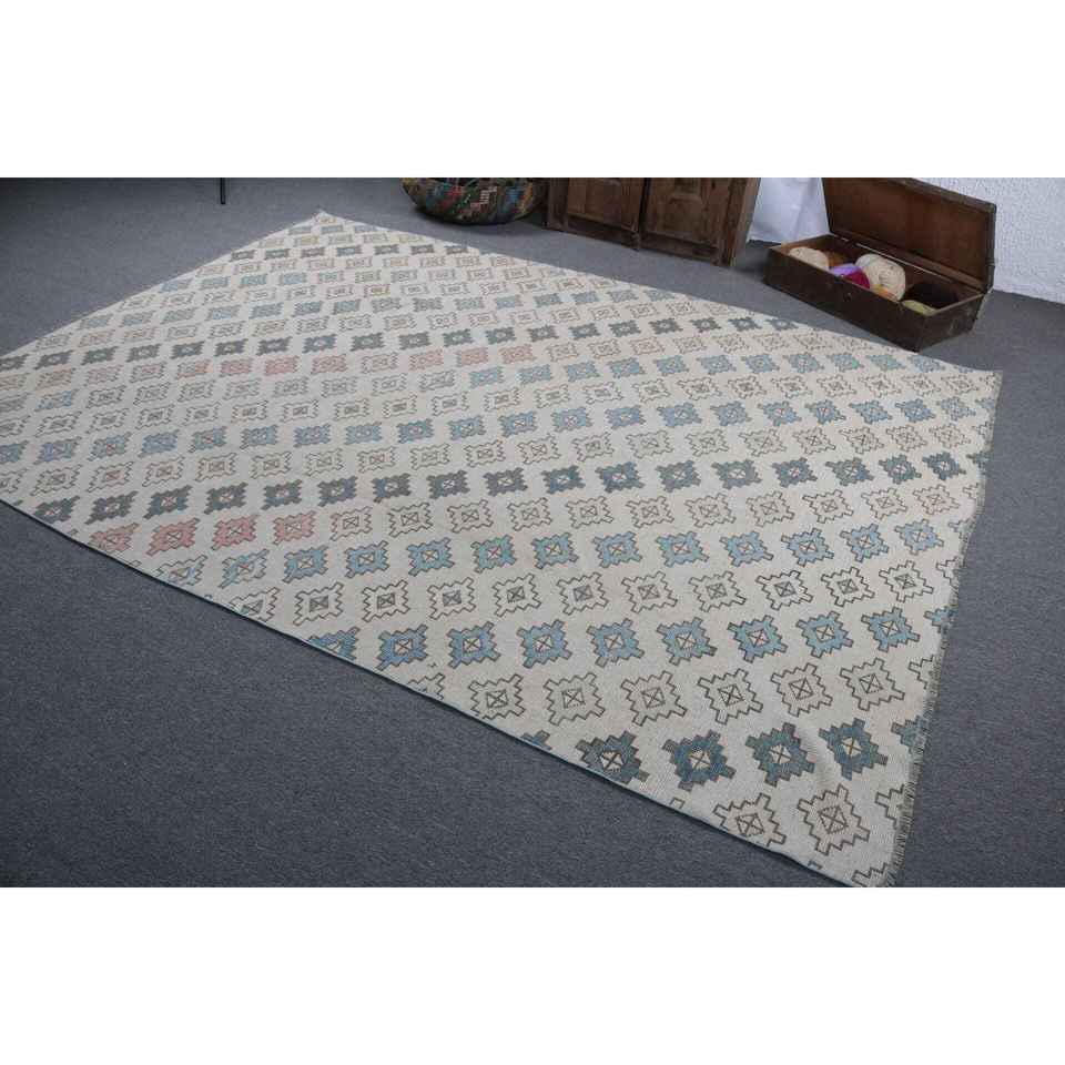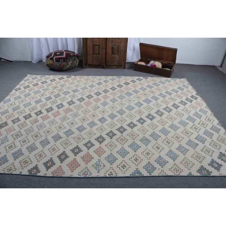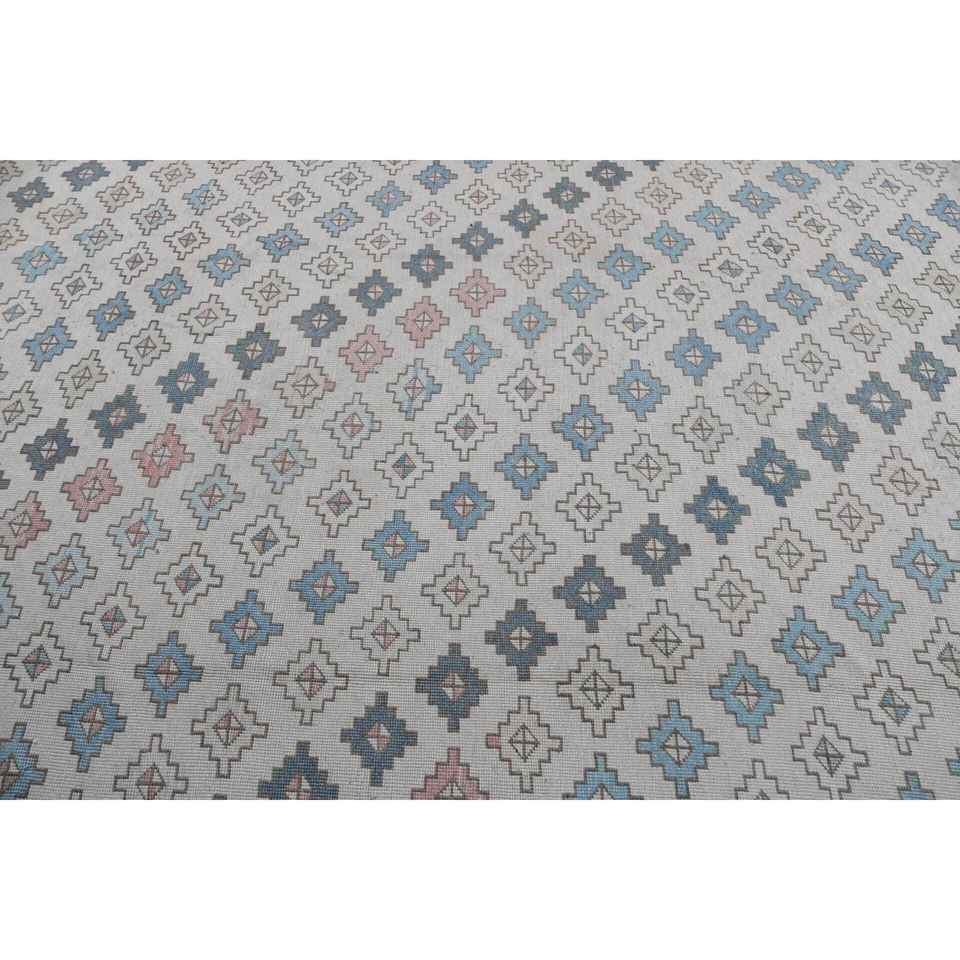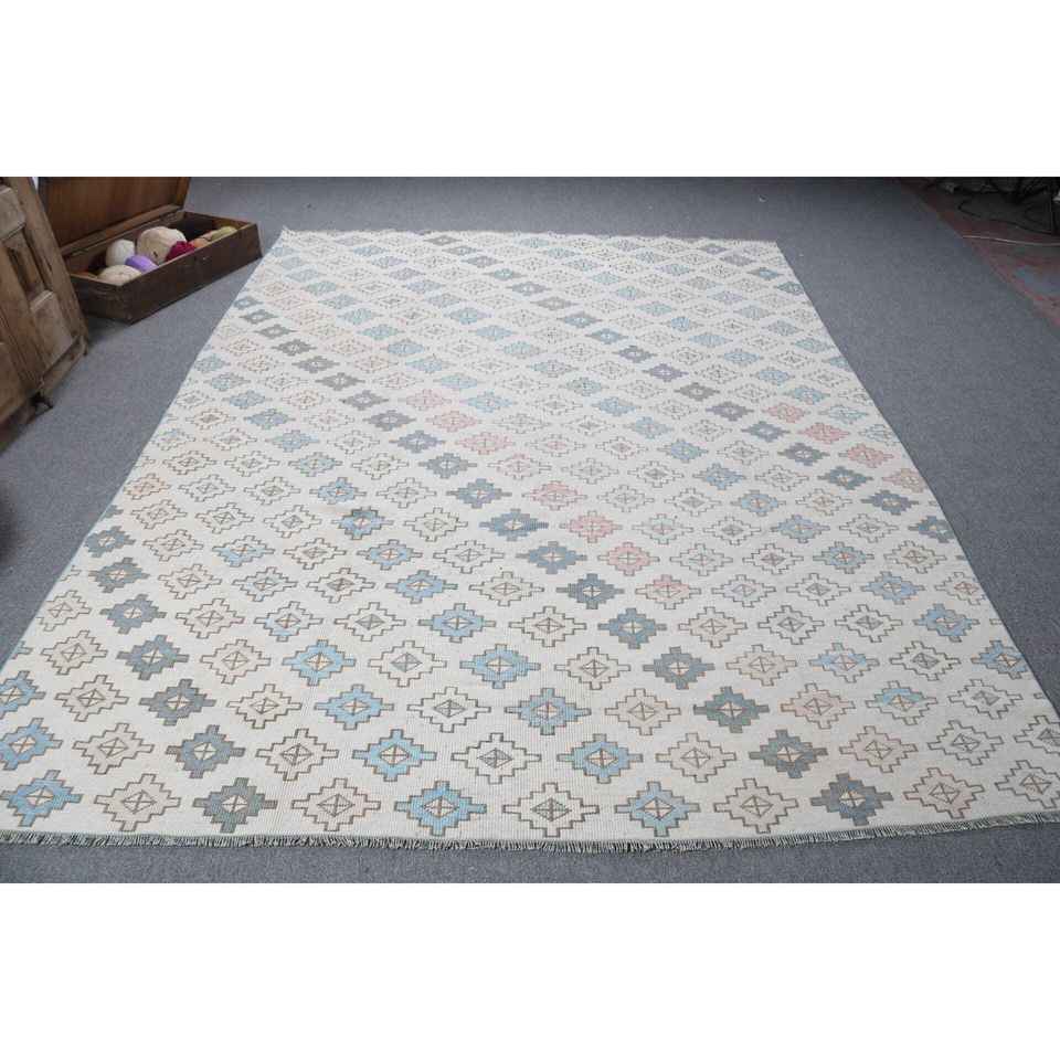 Alfombra Turca Vintage de 7.2x9.7 pies, Alfombra Azul con Diseño Floral