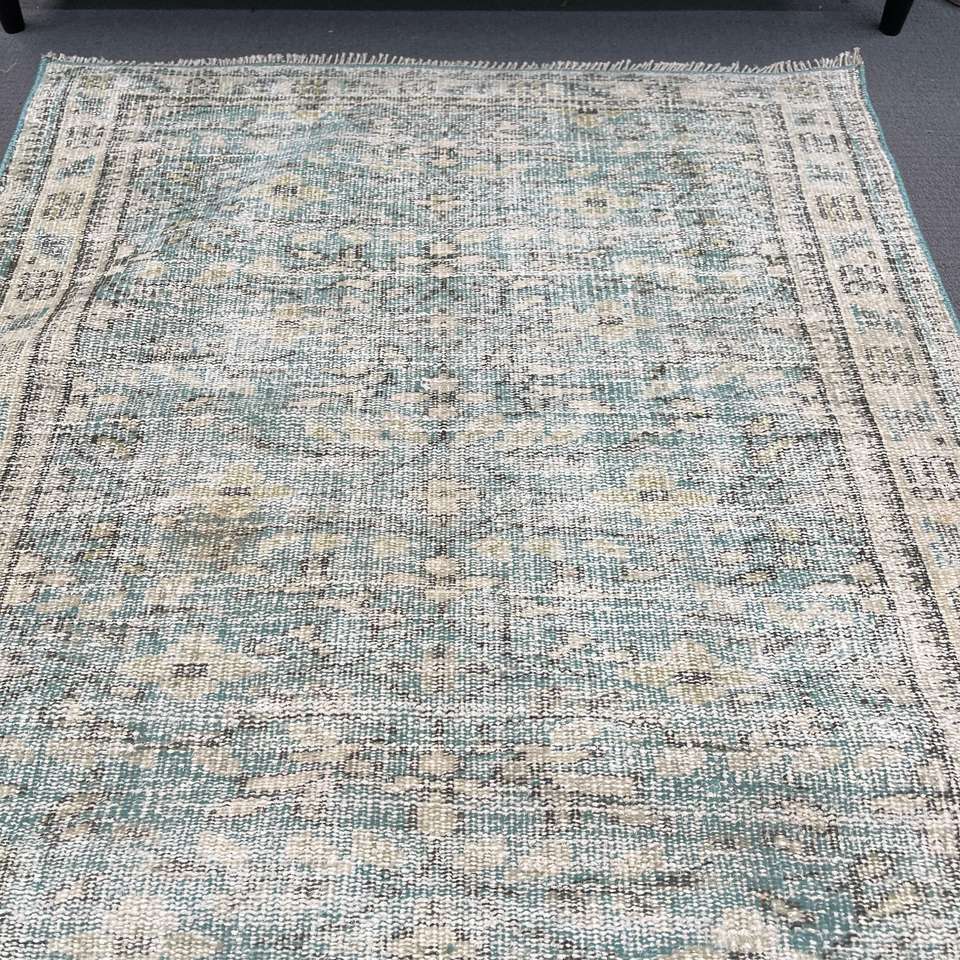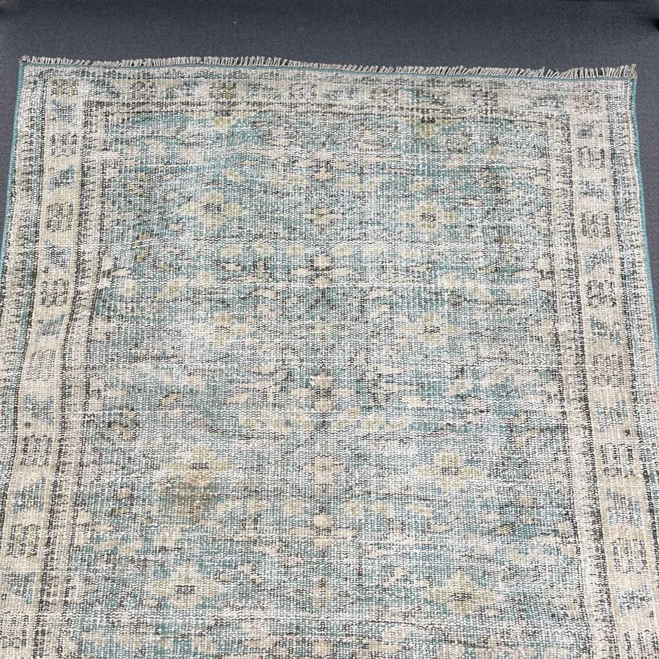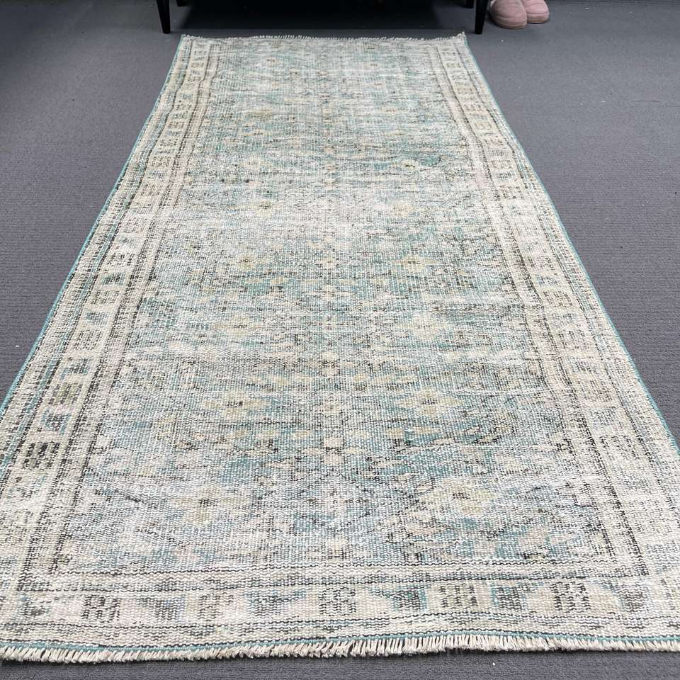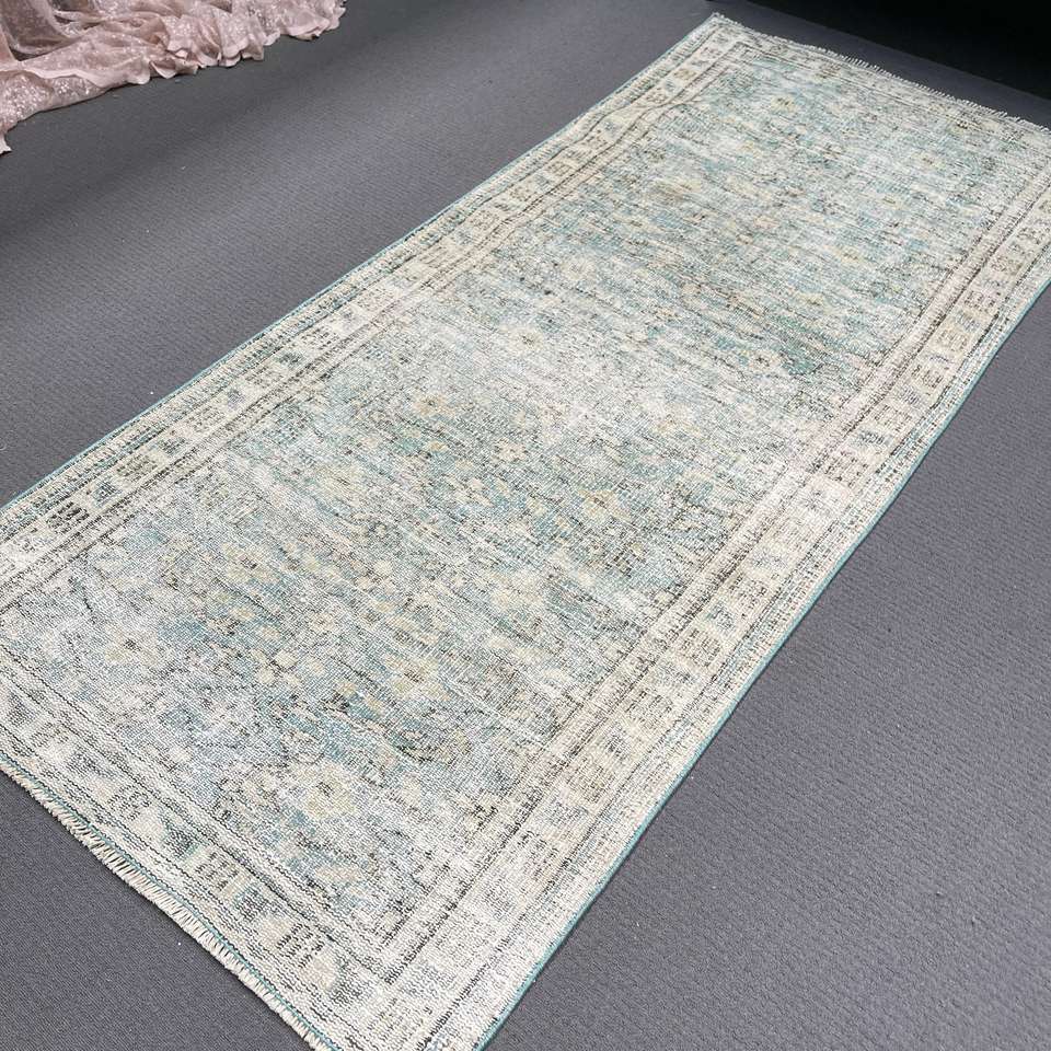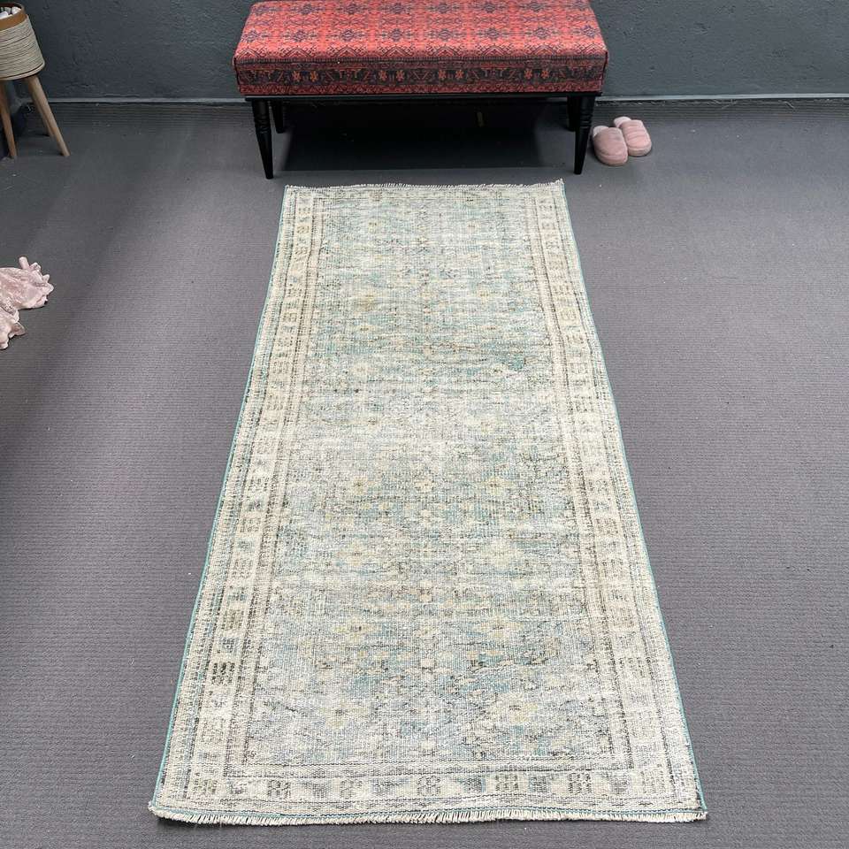 Alfombra Turca Vintage, Alfombra Decorativa de 3.2x7.1 pies (98x217 cm), Alfombra de Lana Azul Sólida