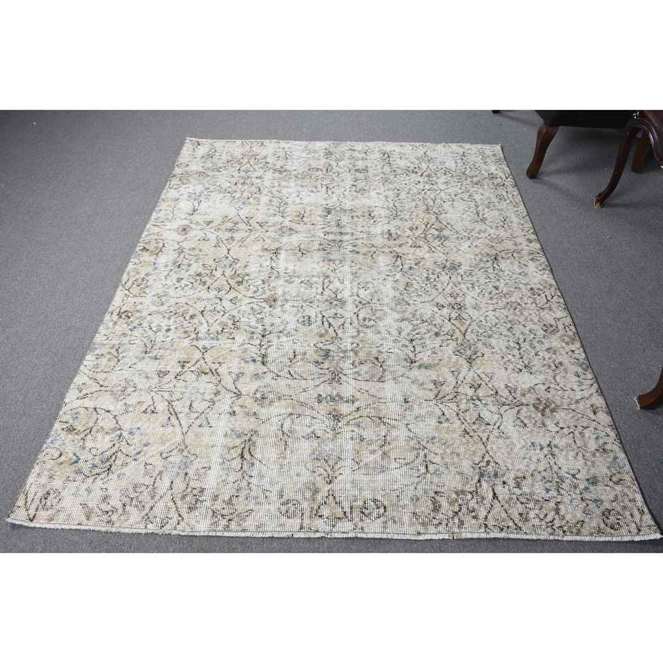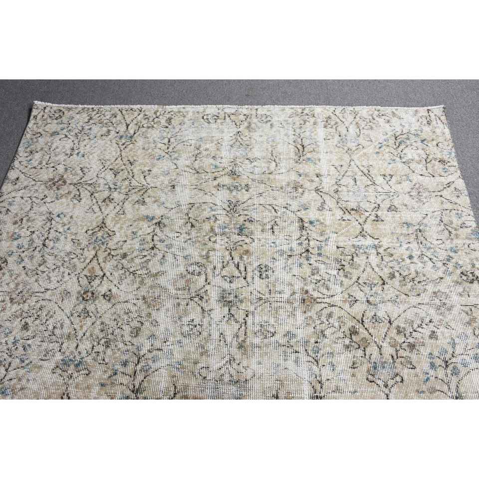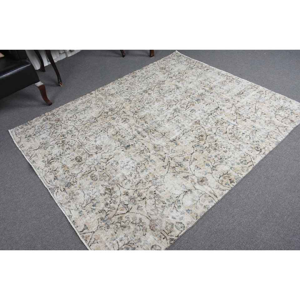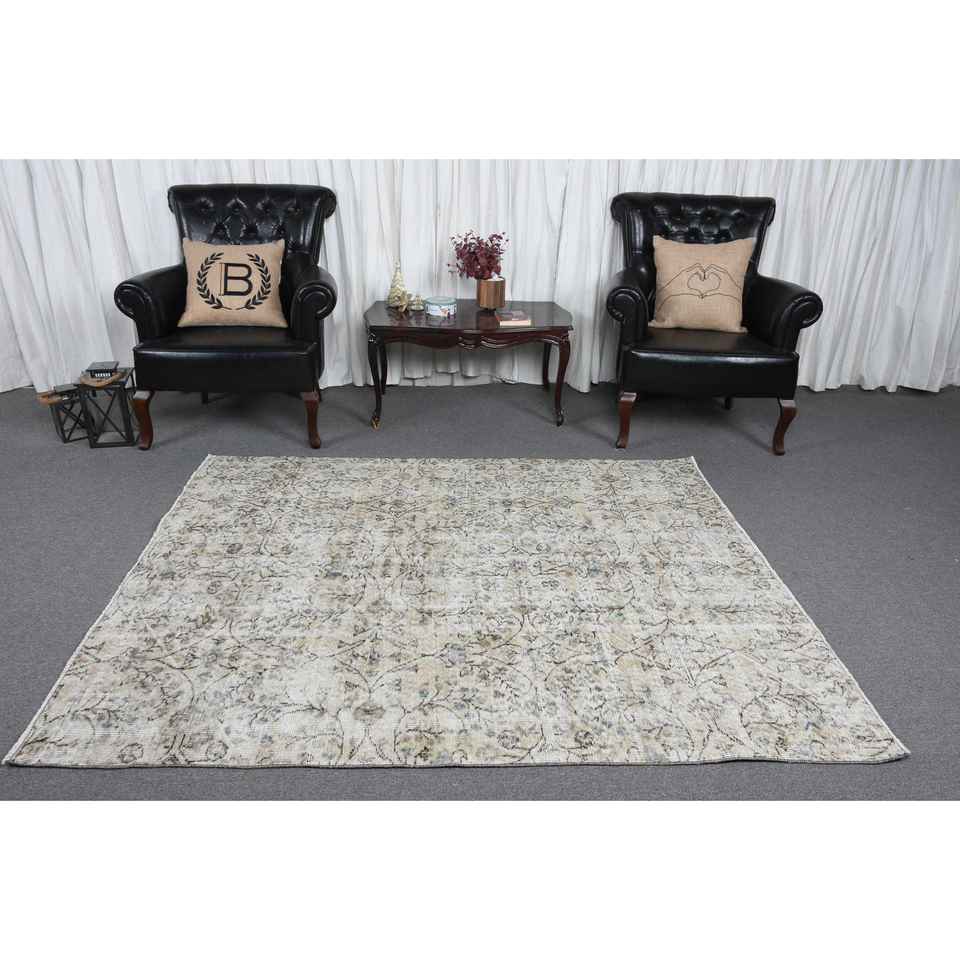 Alfombra Turca Vintage de Patchwork con Base de Látex Ecológica, 5.2x6.4 pies (159x195 cm), Alfombra Persa Blanca de Lana