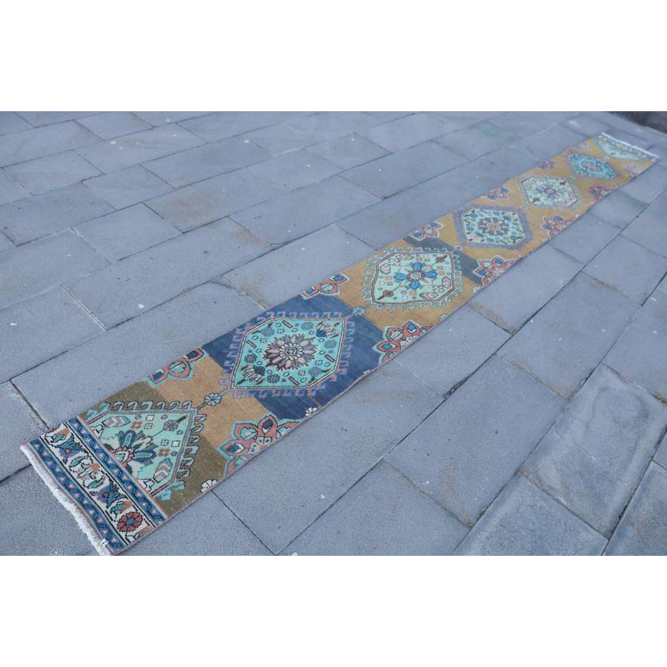 Alfombra Turca Vintage de 1.4x13.3 pies, Alfombra Ombré Azul Marrón
