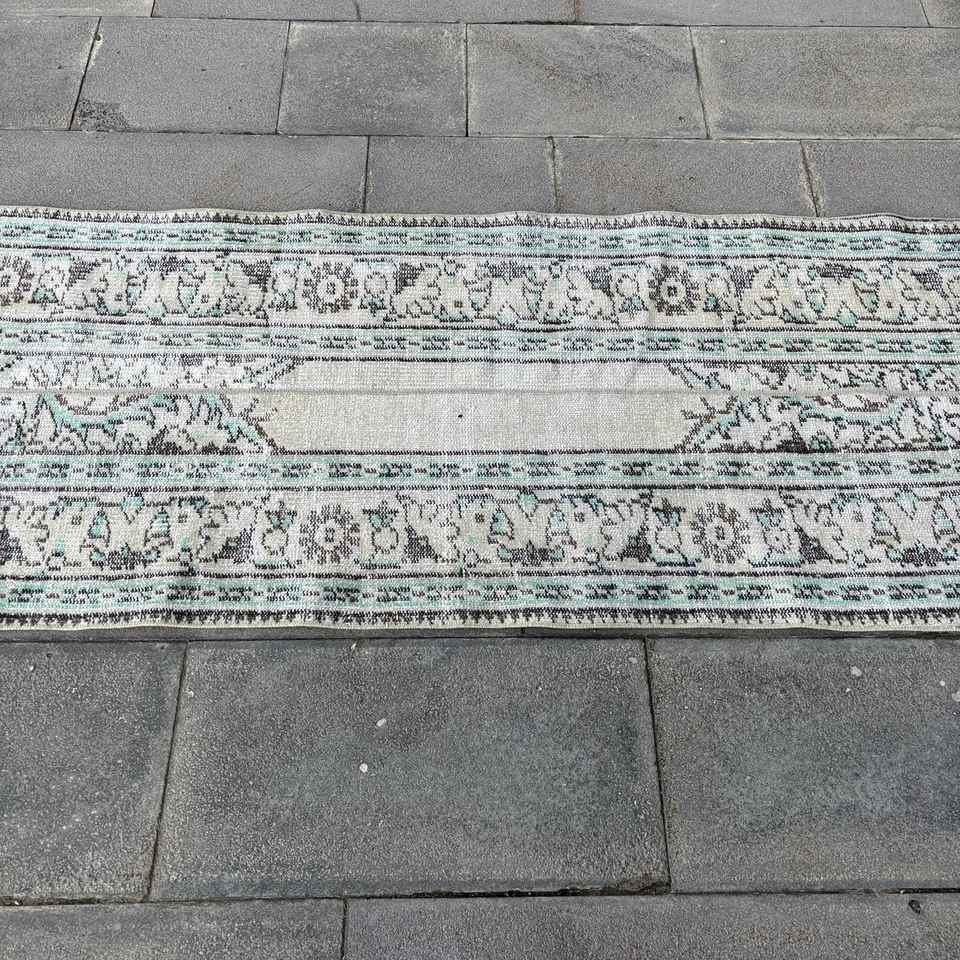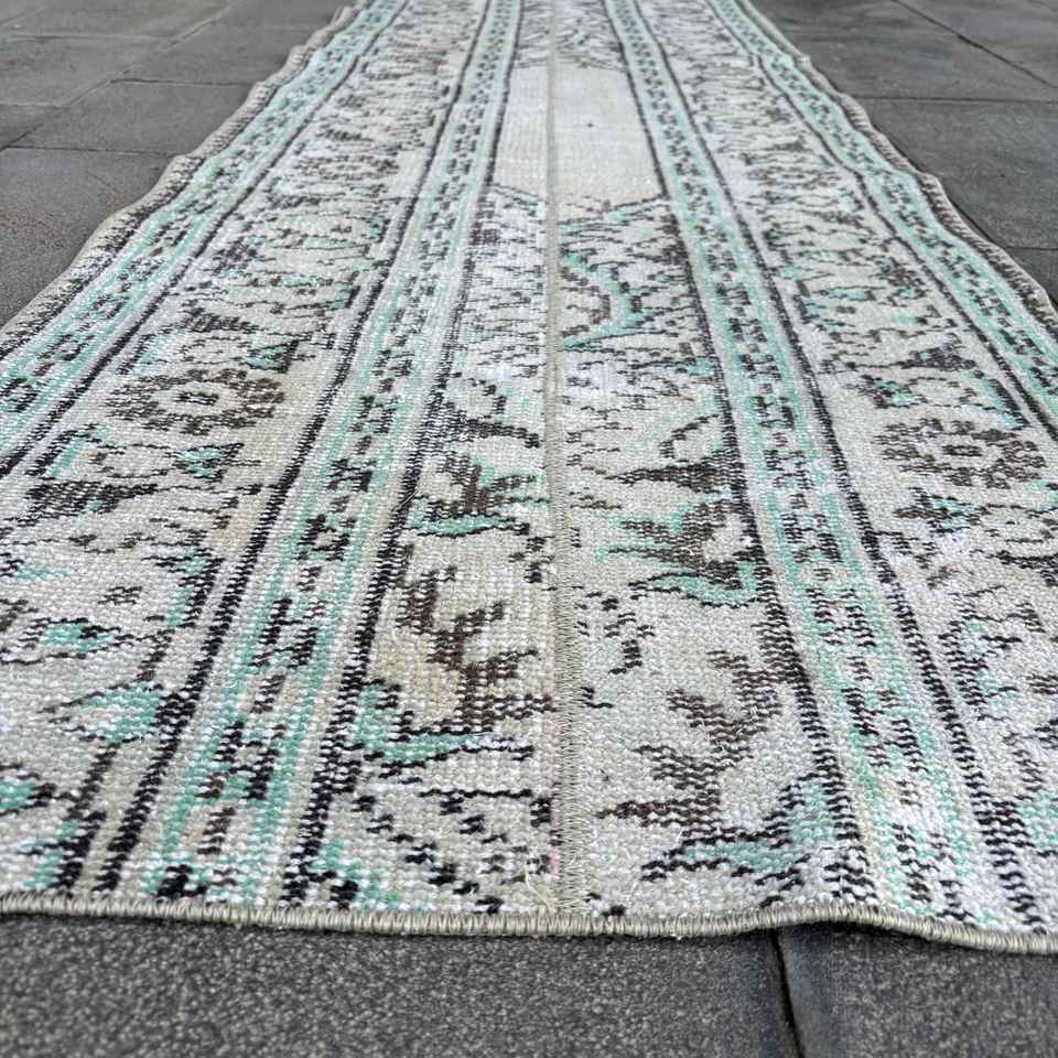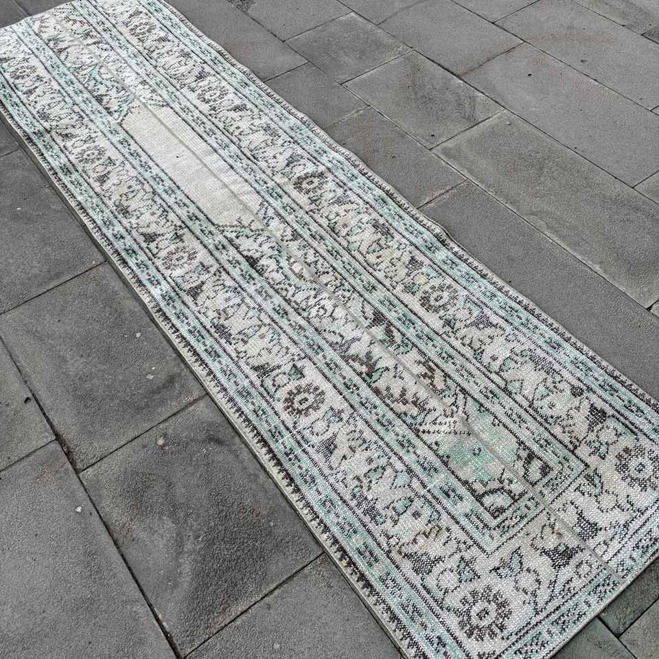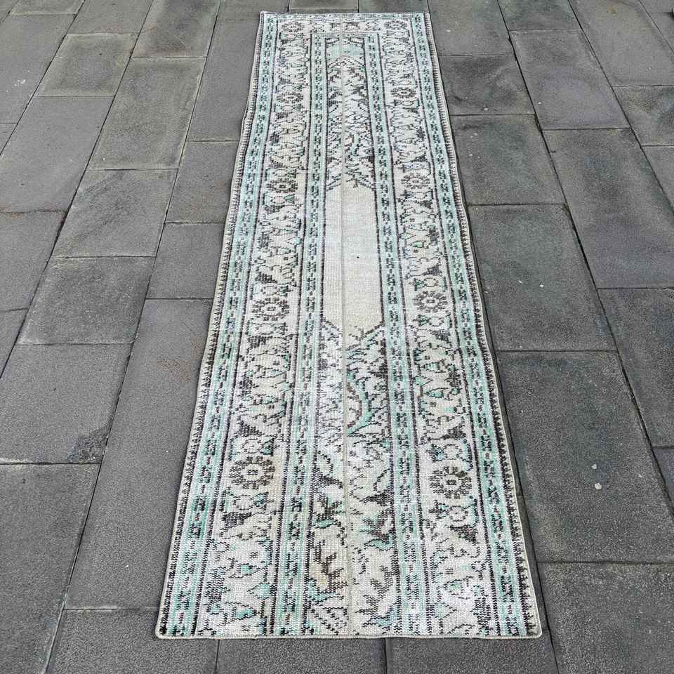 Alfombra Turca Vintage de Patchwork, 2.3x8.4 pies, Ecológica, Gris Azul Degradado, Lana con Base de Látex