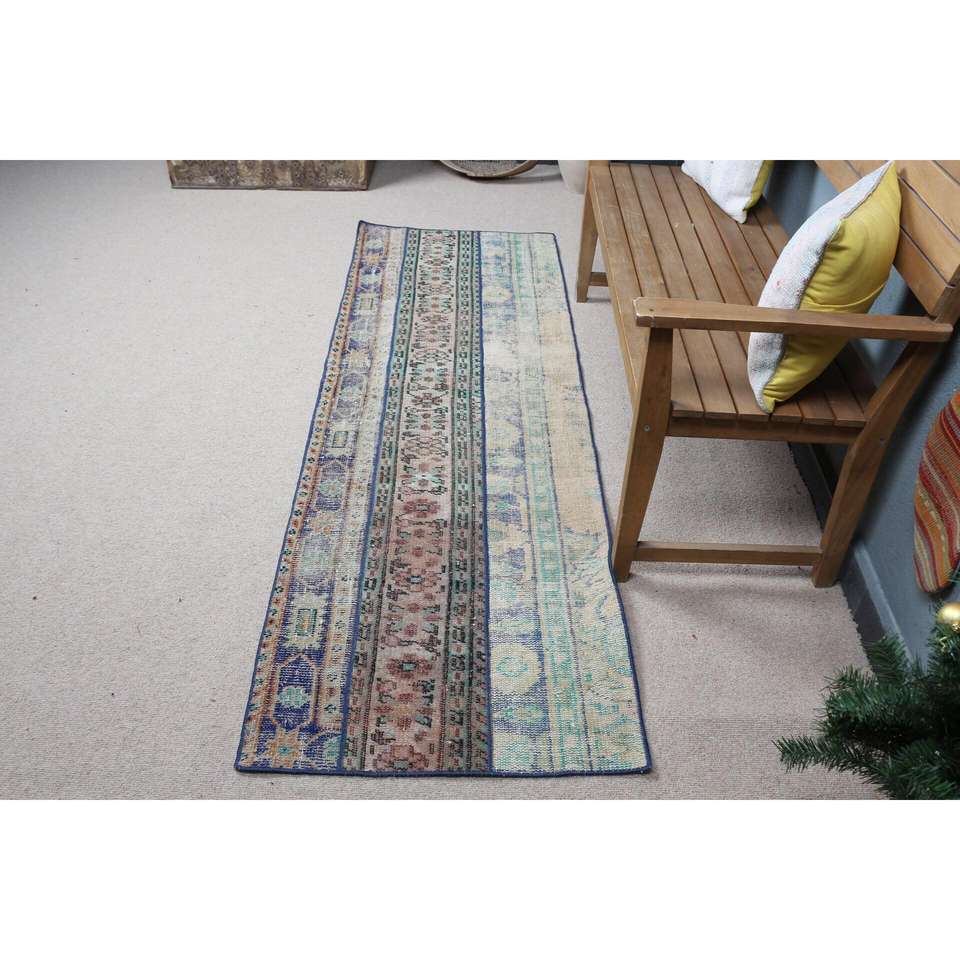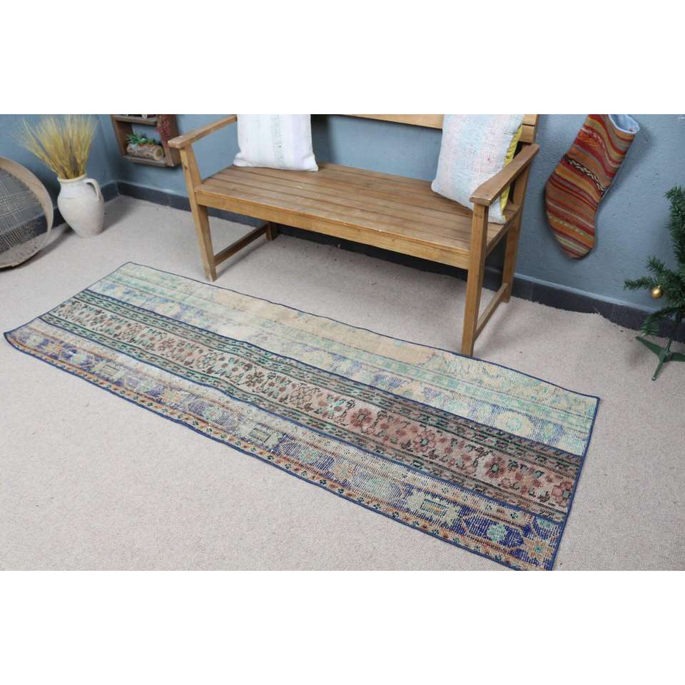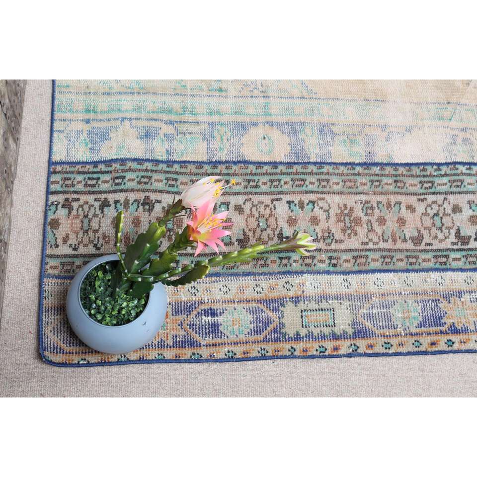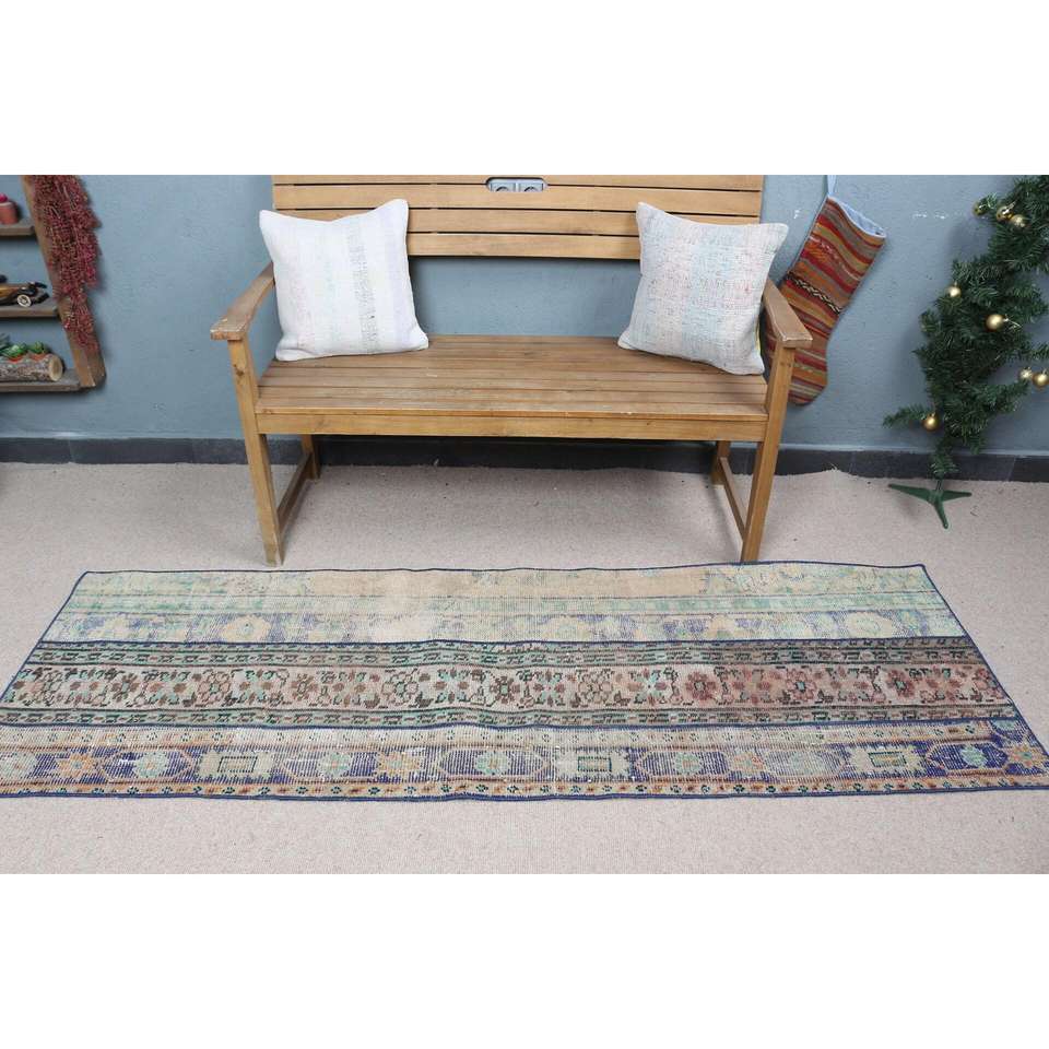 Alfombra Turca Vintage de 2.4x7.1 pies, Alfombra de Lana con Estampado Animal Azul Marrón
