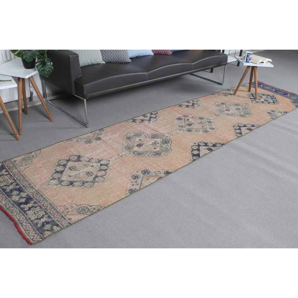 Alfombra Turca Vintage de 2.6x11.4 pies, Alfombra de Lana Marrón Azul Camuflaje