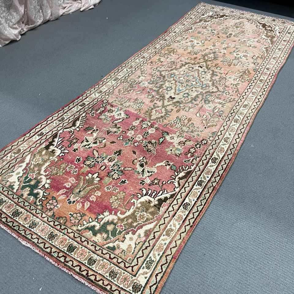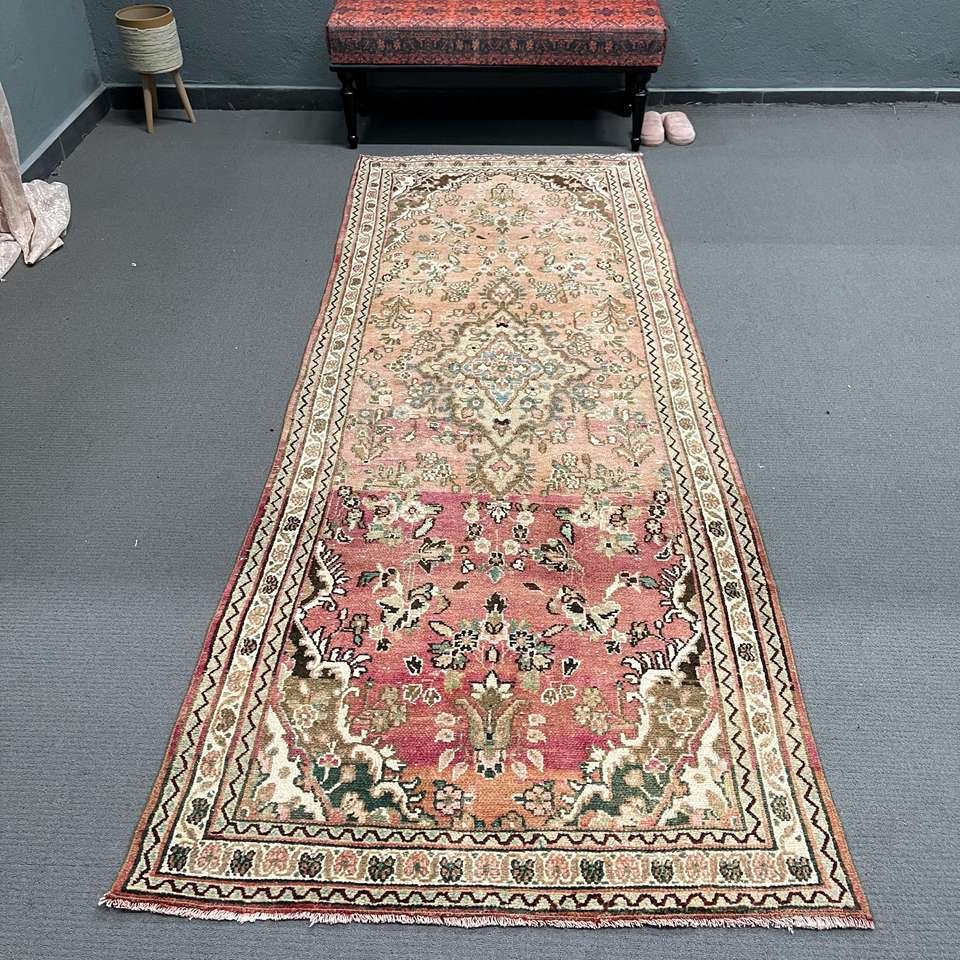 Alfombra Turca Vintage de 3.7x9.7 pies, Alfombra Oriental de Lana Roja y Verde