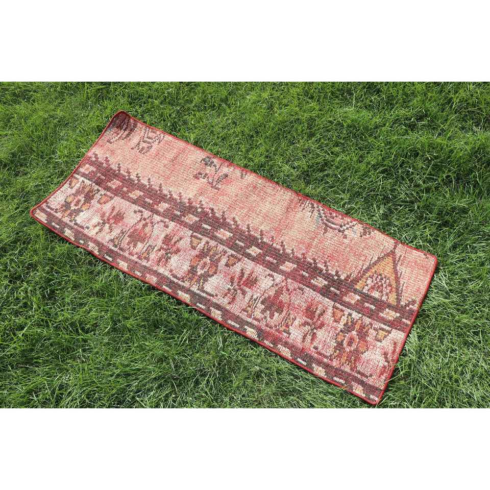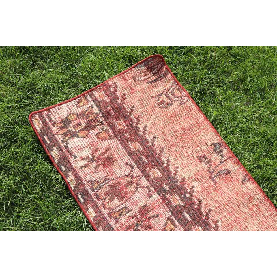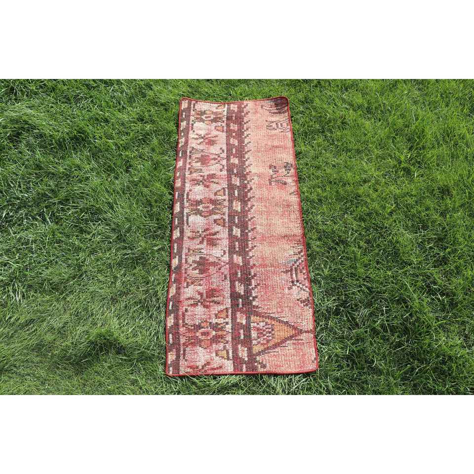 Alfombra Turca Vintage Pequeña de 1.4x3.2 pies, Alfombra de Lana Roja