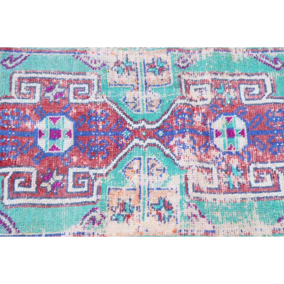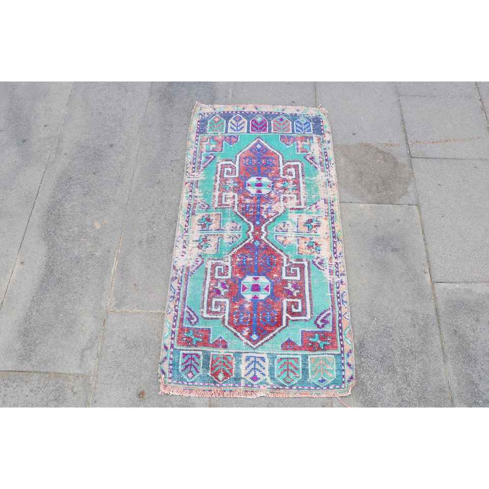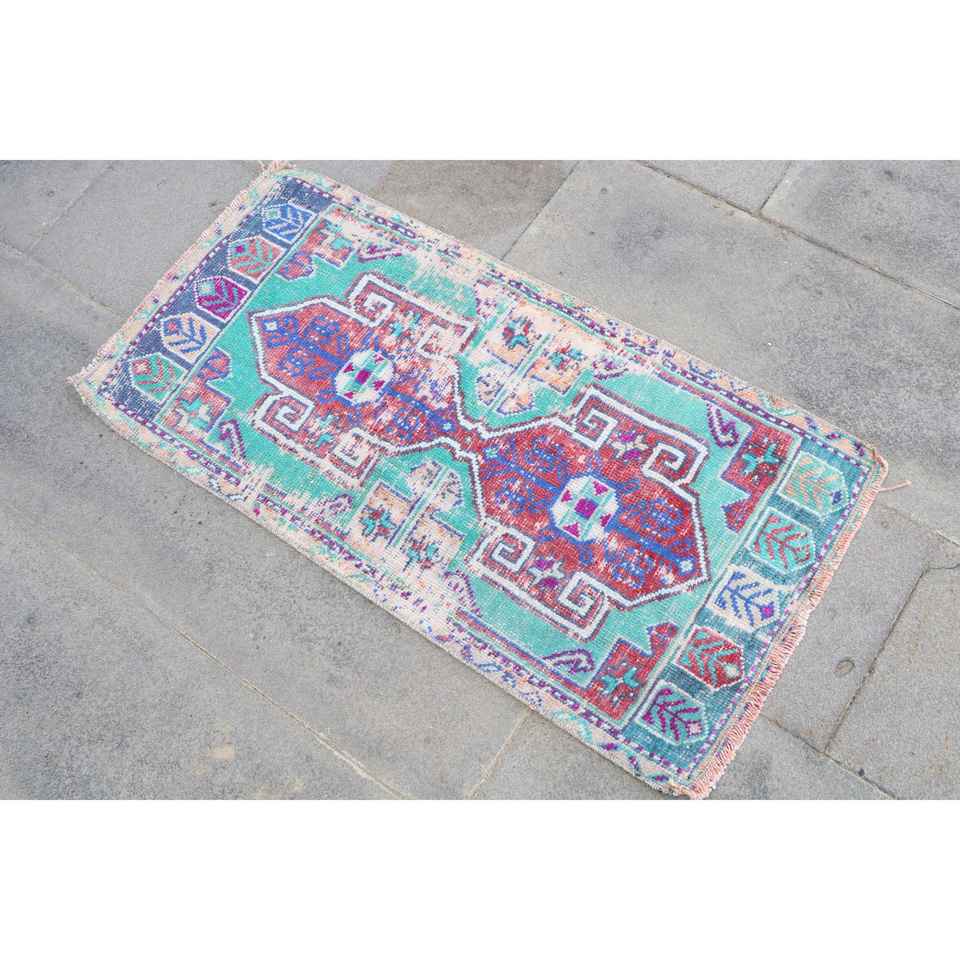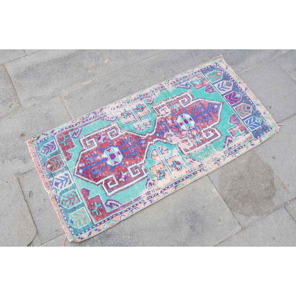 Alfombra Turca Vintage Pequeña de 1.6x3.1 pies, Alfombra de Lana con Diseño Floral Azul y Rojo