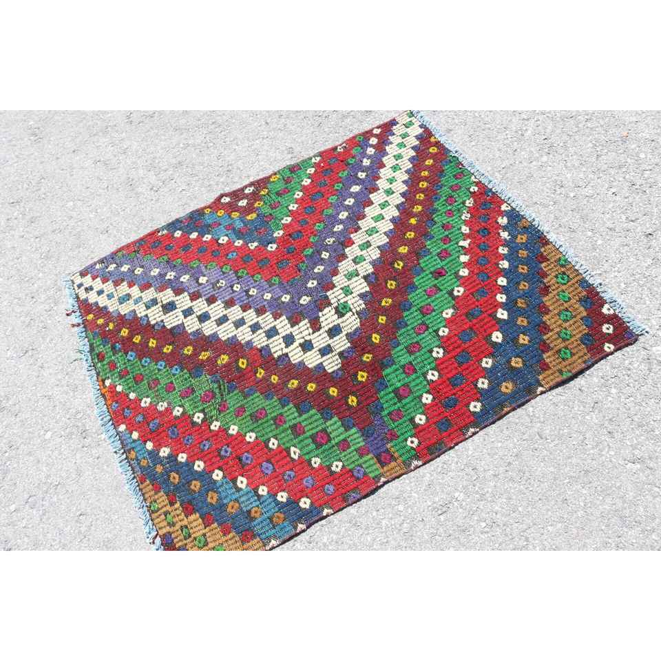 Alfombra Turca Vintage Pequeña de 3.2x3.9 pies, Alfombra de Lana Roja Kilim