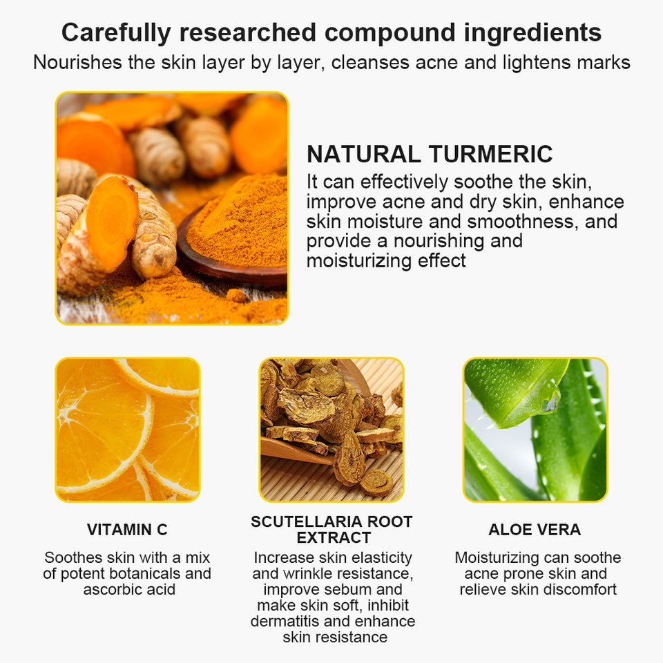 Vitamina C, Aloe vera, El ácido salicílico, Glicerina, NATURAL TURMERIC, SCUTELLARIA ROOT EXTRACT, AQUA, PROPYLENE GLYCOL, DIMETHICONE, SALIX ALBA (WILLOW) BARK EXTRACT, SPIRAEA ULMARIA EXTRACT, VERBENA OFFICINALIS LEAF EXTRACT, HAMAMELIS VIRGINIANA (WITCH HAZEL) EXTRACT, HOUTTUYNIA CORDATA EXTRACT, BUTYLENE GLYCOL, 1,2-HEXANEDIOLIngrediente principal