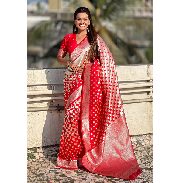 Turn Heads In Red Banarasi Sari de seda suave con llamativo arte tejido Zari en 3D perfecto para grandes celebraciones