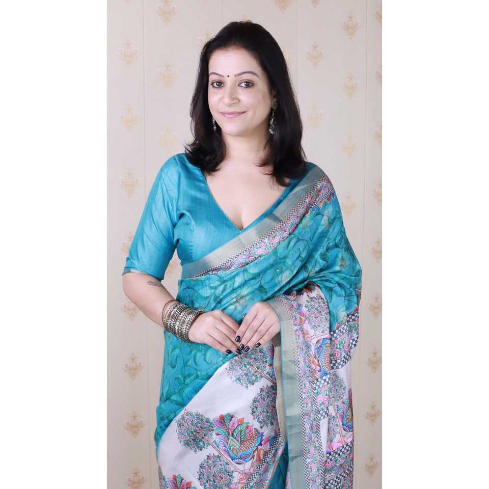 Sari de Seda Tussar Azul Turquesa Elite Weaves con Estampado Madhubani Fusion, Borde Tejido con Zari con Patrón Floral, Estilo Étnico