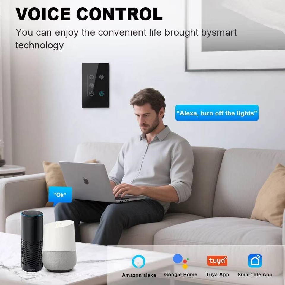 Ventilador de Techo Inteligente Tuya con WiFi + 2 Interruptores de Luz, Estándar Estadounidense, Panel Táctil de Vidrio de 3 Grupos, Compatible con Alexa y Google Home