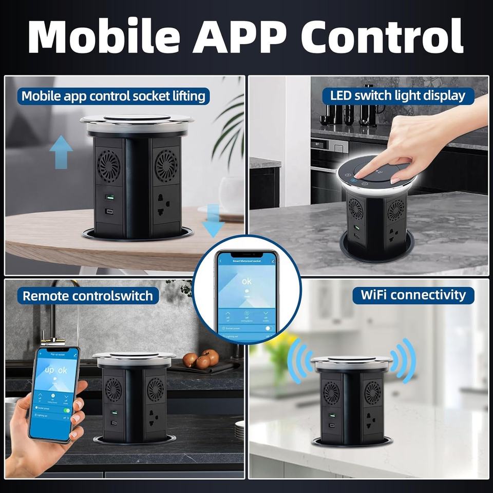 Enchufe de Mesa Emergente Automático con Pantalla Táctil WIFI Tuya, Enchufe Empotrado Impermeable IP65 con Altavoz y Cargador Inalámbrico