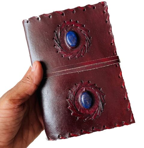Dos piedras azules incrustadas de cuero genuino diario Correa envoltura alrededor de tapa dura diario Vintage A5 páginas en blanco cuaderno libro de sombra