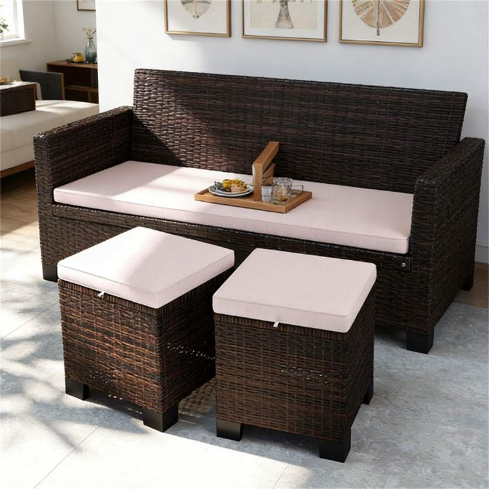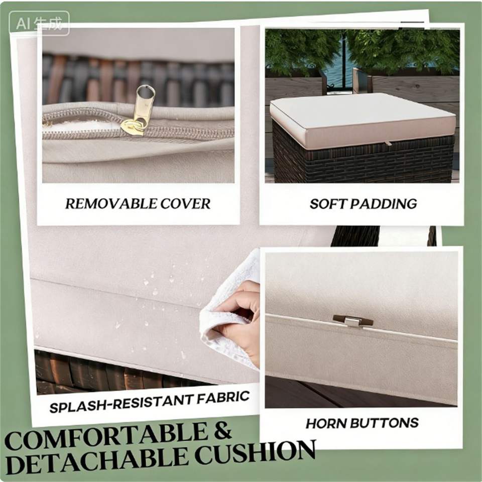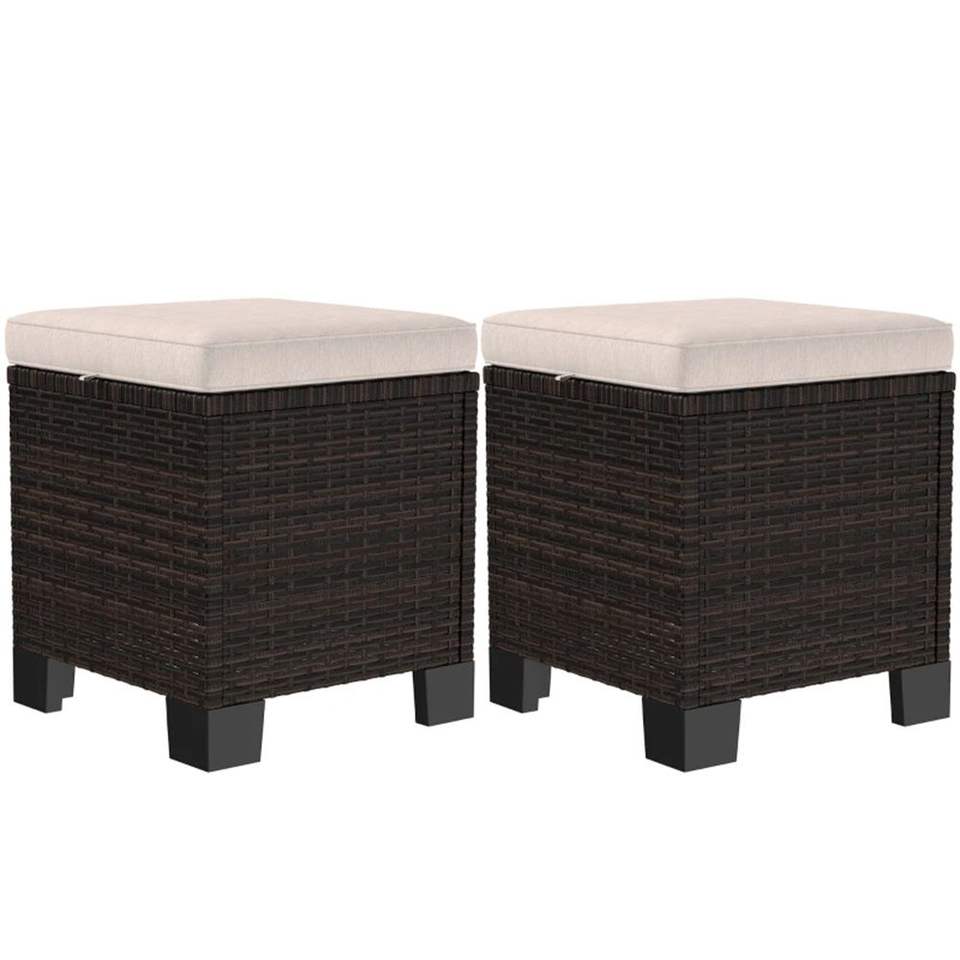 Taburete de terraza de dos piezas para exteriores con reposapiés de ratán y cojín color crema, mueble de patio