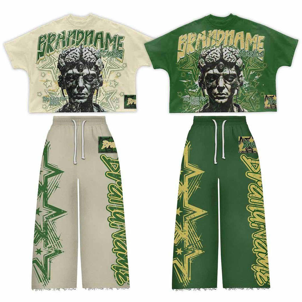 Conjunto de Dos Piezas, Camiseta Corta Estampada de Punto Sólido con Tachuelas y Pantalones Anchos de Estilo Urbano, Transpirables, de Verano, Unisex