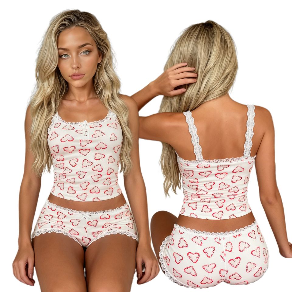 Conjunto de Ropa Casual para Mujer, Tejido Básico, Camisola Corta, Pantalones Cortos Ajustados, Adorno de Encaje con Corazones, Ecológico, Transpirable, de Secado Rápido