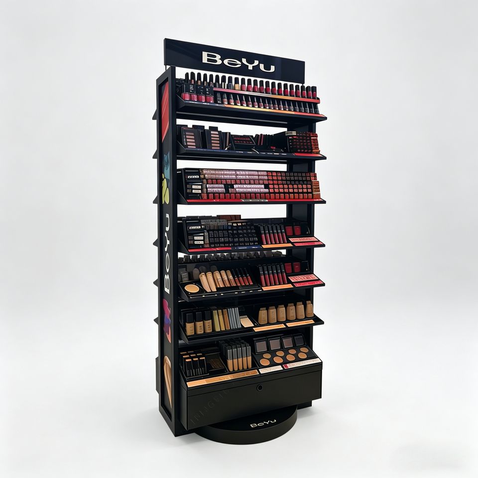 Exhibidor Giratorio de Metal de 360 Grados con Dos Caras, con Estantes y Cajones de Almacenamiento, Exhibidor de Pie para Tienda de Productos de Belleza