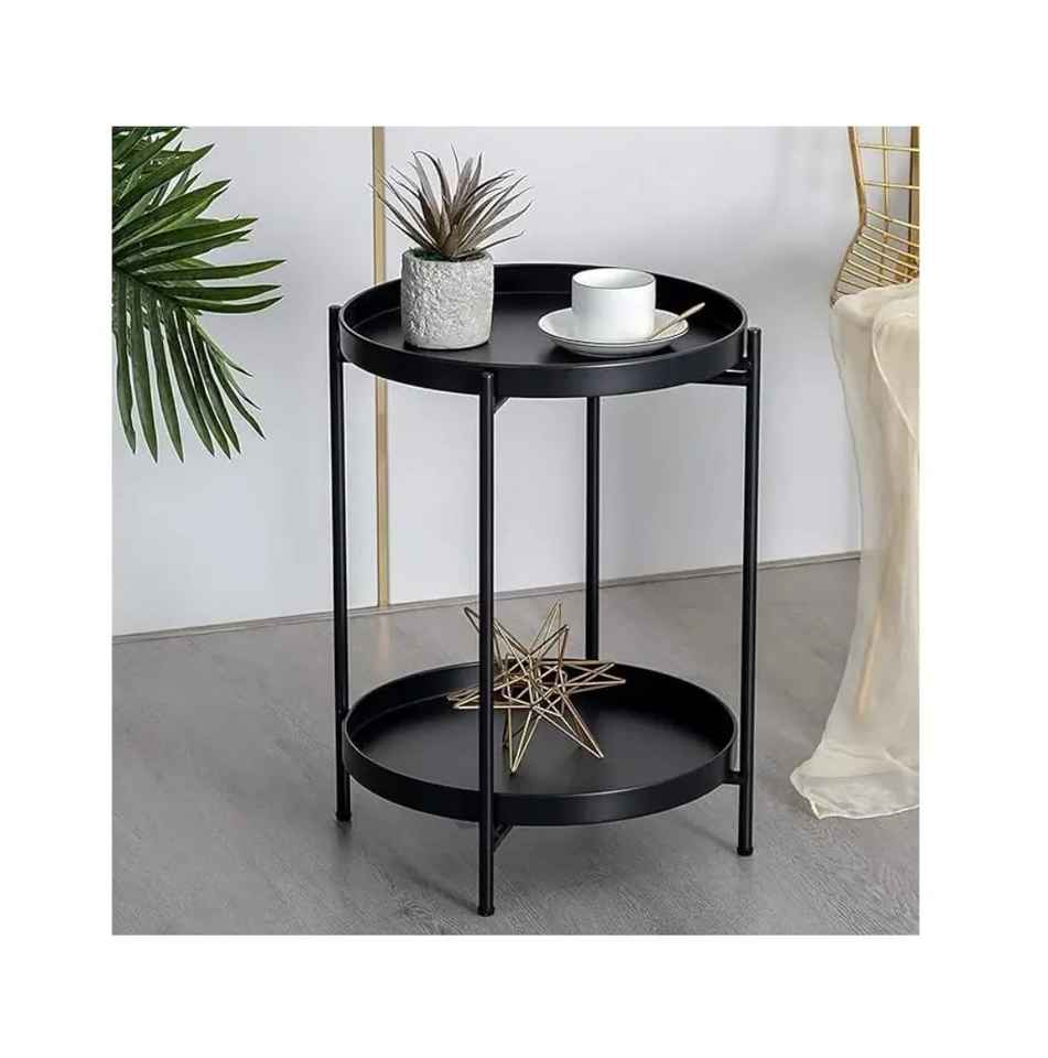 Two Tier Adjustable Height Portable Side Table Black Metal Frame Minimalist Modern Handcrafted Eco Friendly Living Room Bedroom