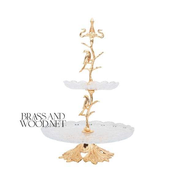 Soporte de servicio de latón macizo dorado y cristal de dos niveles