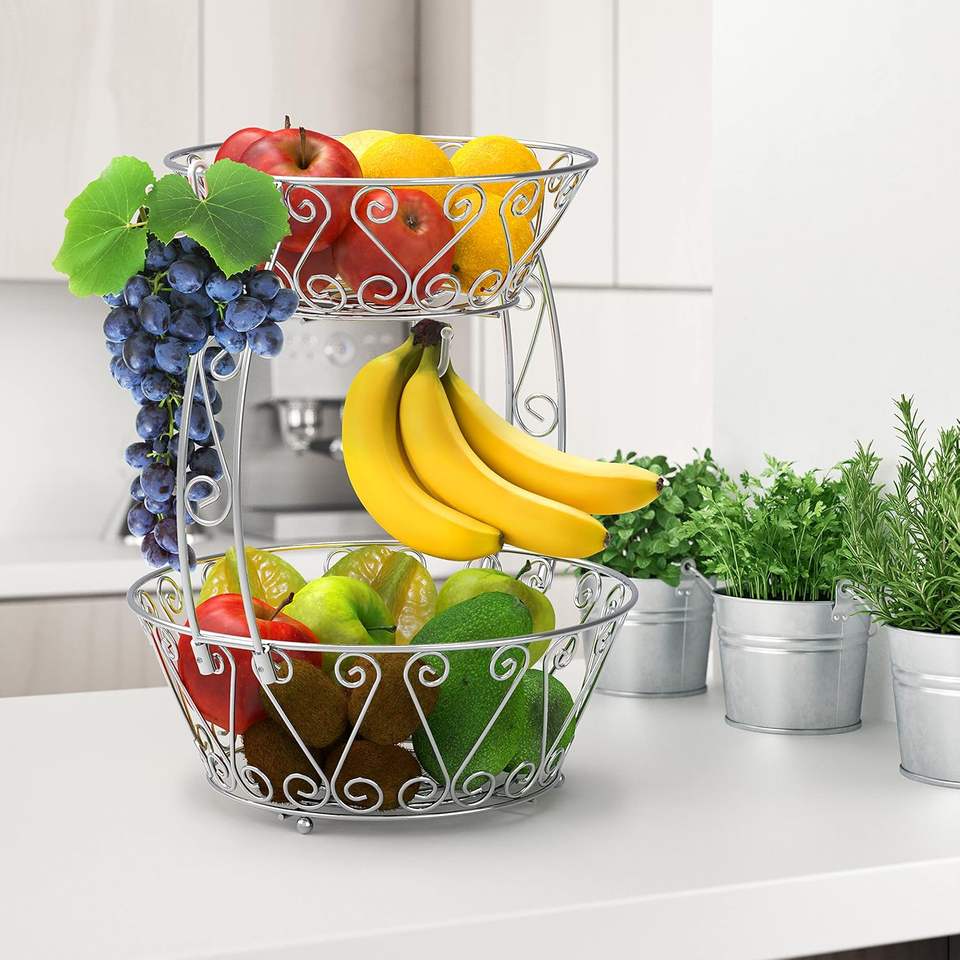 Cesta de frutas redonda de dos niveles Metal de alta calidad bellamente hecha a mano para el hogar Cocina usos de almacenamiento multiusos