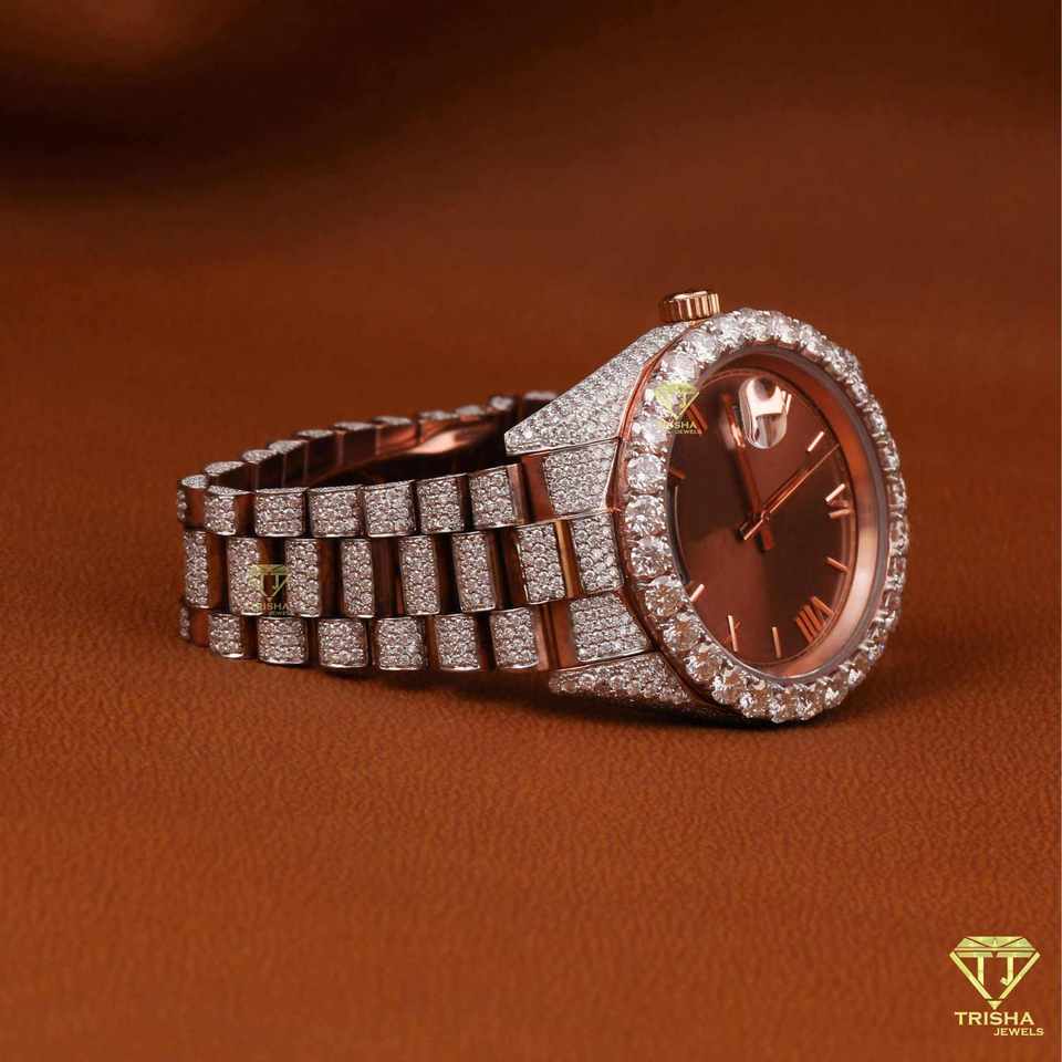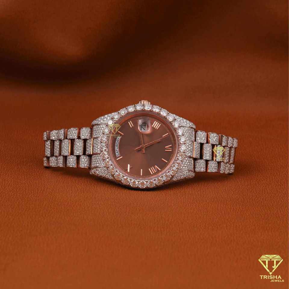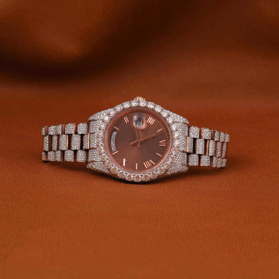 Reloj mecánico de lujo de acero inoxidable con esfera marrón de dos tonos totalmente IcedOut Moissanite Vintage Hip Hop estilo clásico banda de cristal