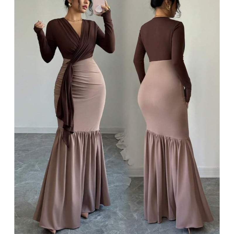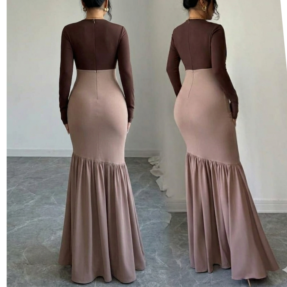 Vestido Maxi Sirena de Dos Tonos con Cuello Cruzado y Dobladillo con Volantes