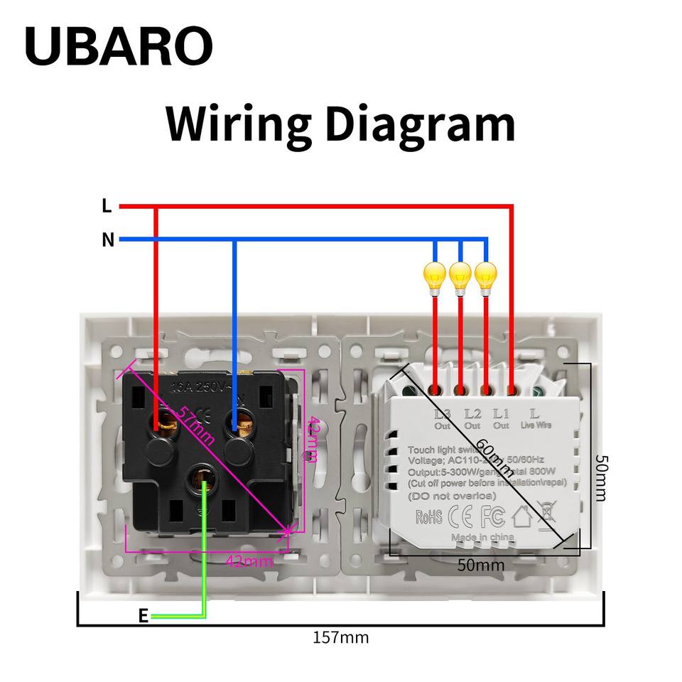 157 Interruptor táctil de tres vías, blanco, de un solo polo, con enchufe europeo y USB.