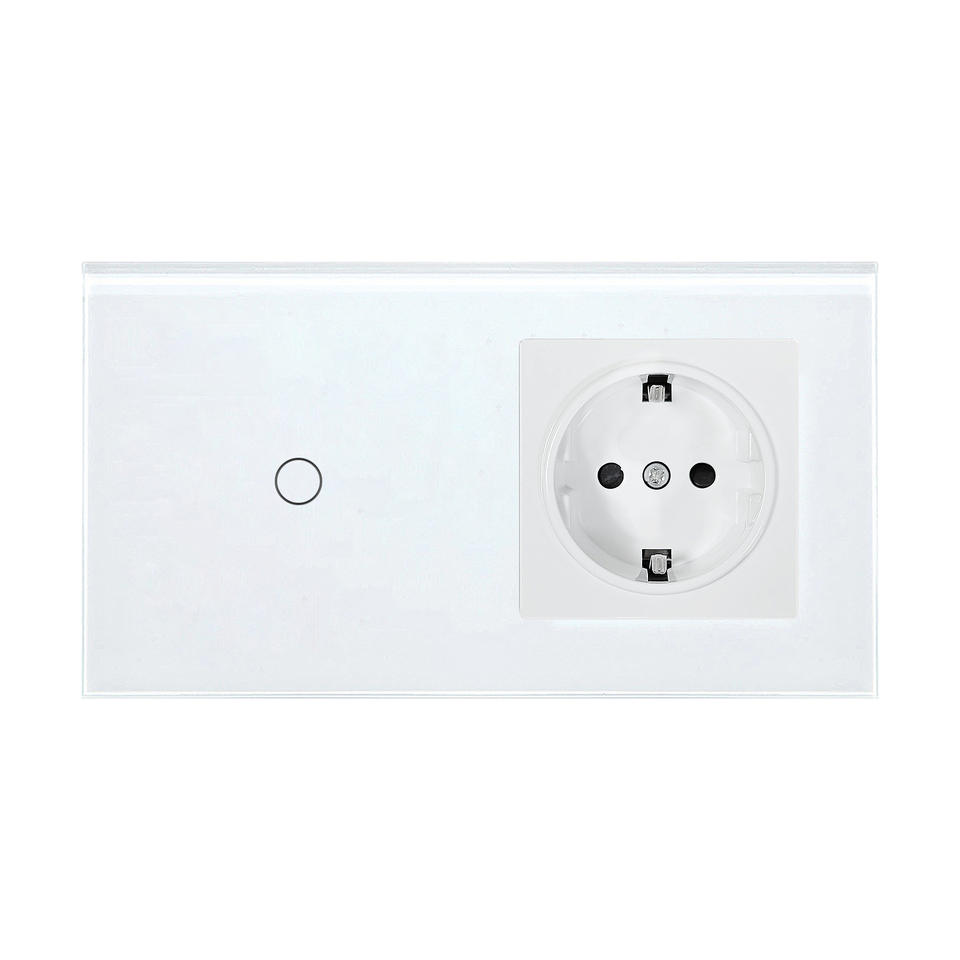 Interruptor Táctil Tipo 153 con Enchufe Europeo, 10A, 60x60mm, Panel de Vidrio Templado Blanco con Aislamiento Ignífugo