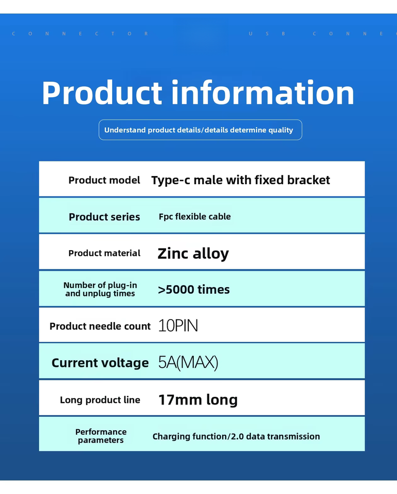 Conector Macho Extensible Tipo C10P con Clip Trasero y Soporte Fijo para Cable FPC de Carga Inalámbrica USB