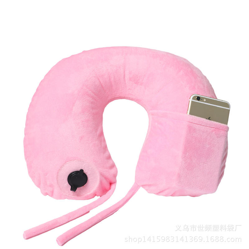 Almohada de viaje inflable con forma de U, color azul oscuro, con bolsillo para teléfono, plegable, portátil, 28x26x14cm