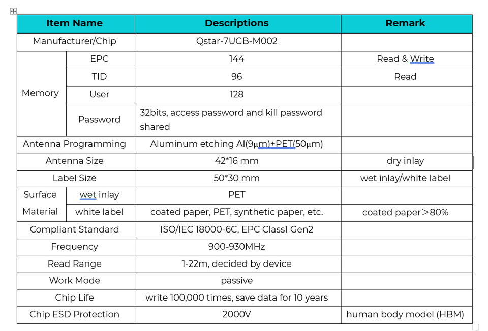 Descripción:Incrustación RFID UHF 50x30 mm (U9)