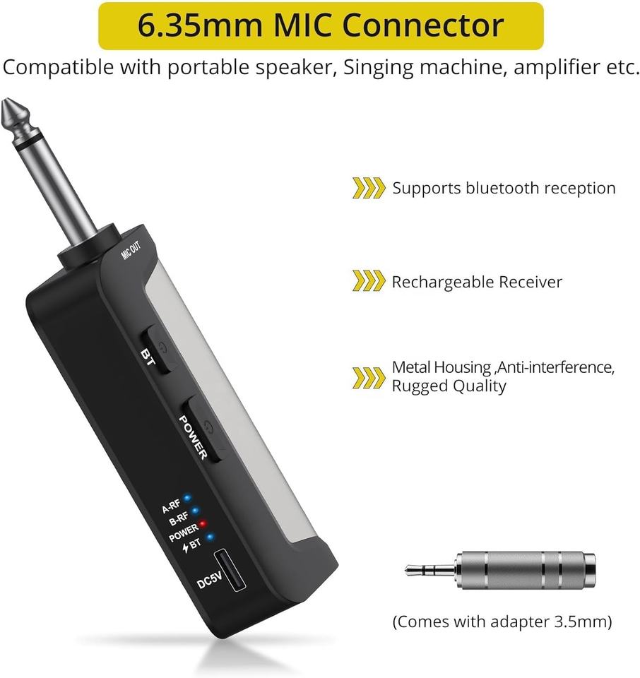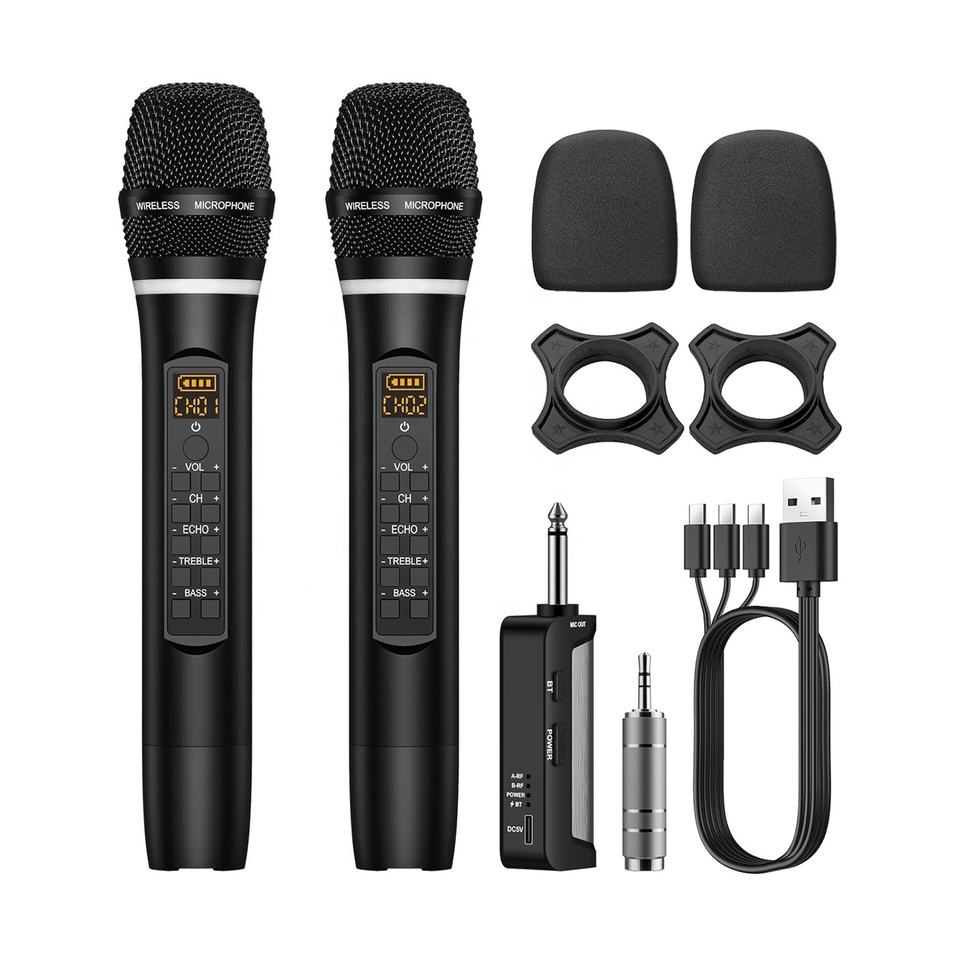 Sistema de Micrófono Inalámbrico UHF Recargable de Doble Micrófono Dinámico para Karaoke con Control de Agudos, Graves y Eco
