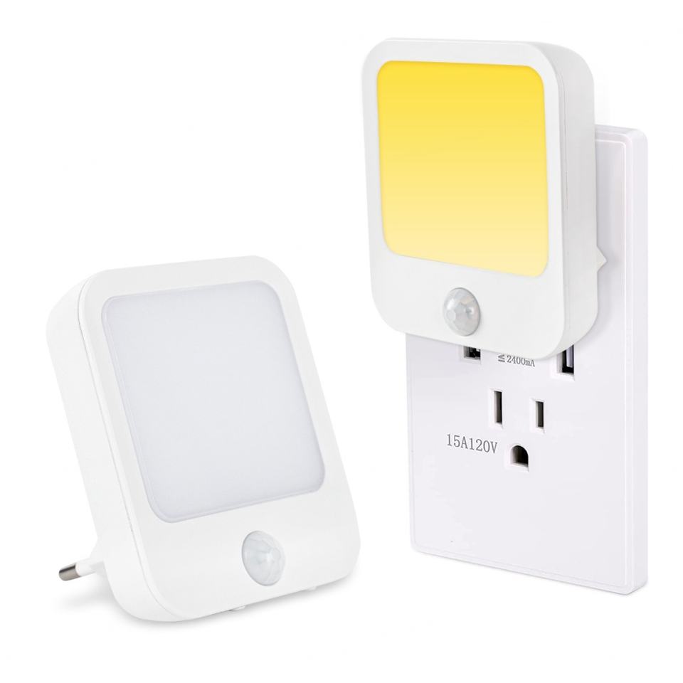 Luz Nocturna LED con Sensor de Movimiento, Enchufe Estadounidense y Europeo, Brillo Ajustable, Blanco Cálido, para Niños, Adultos, Baño, Dormitorio