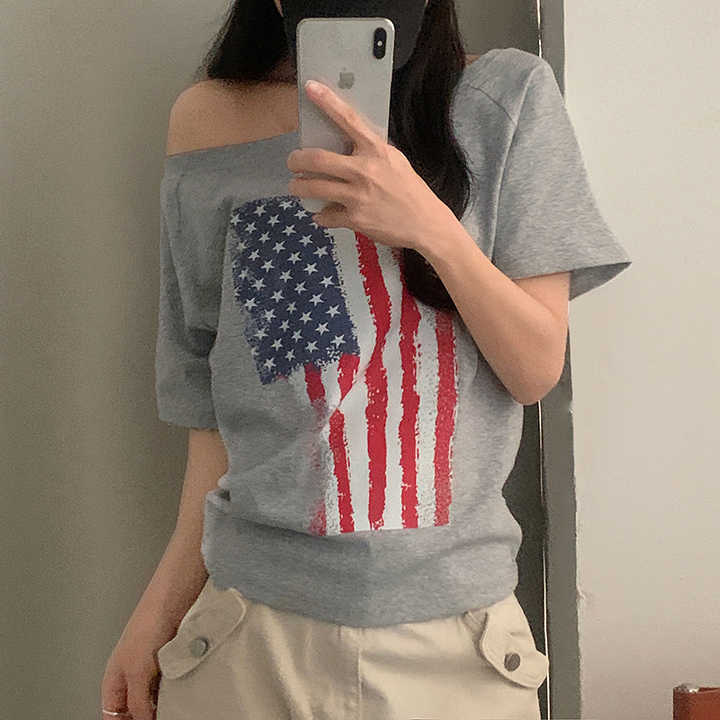 Camiseta de un solo hombro con estampado gráfico extragrande estilo callejero estadounidense para mujer, ajuste holgado, hombro caído, manga corta, informal