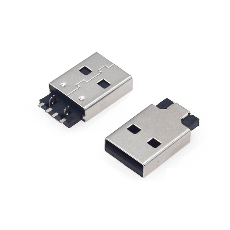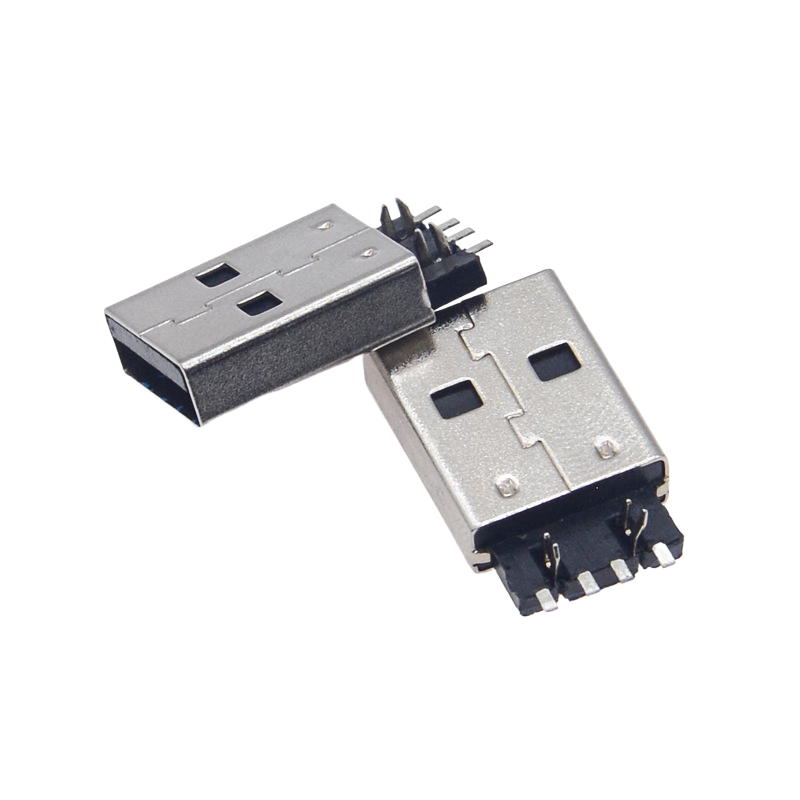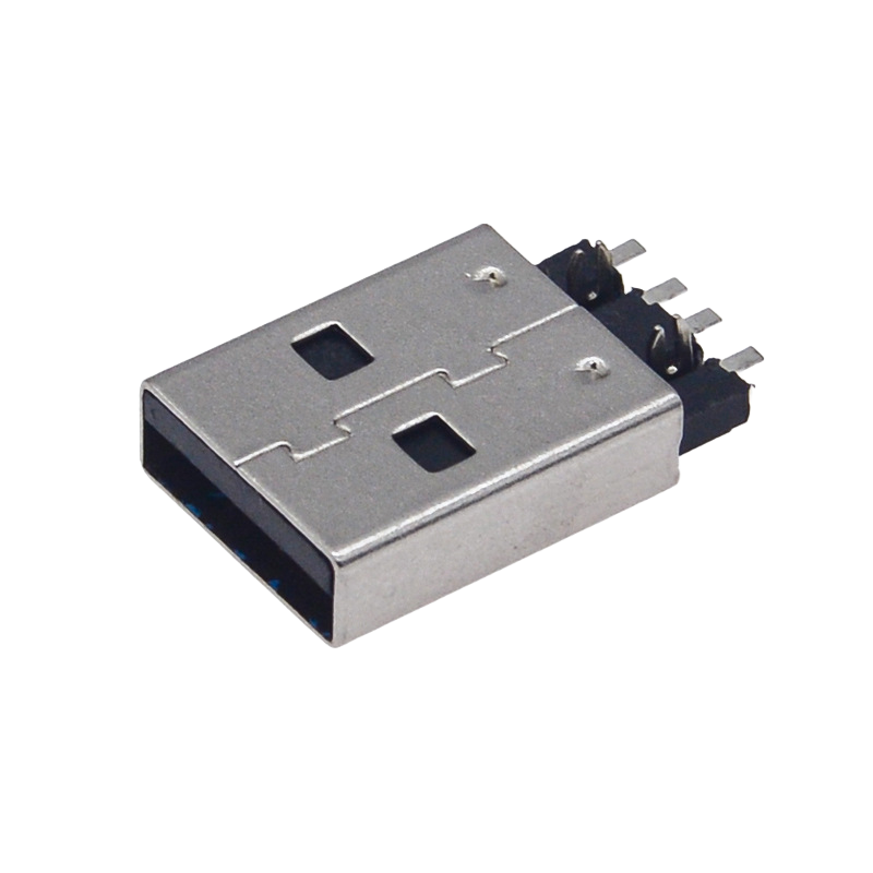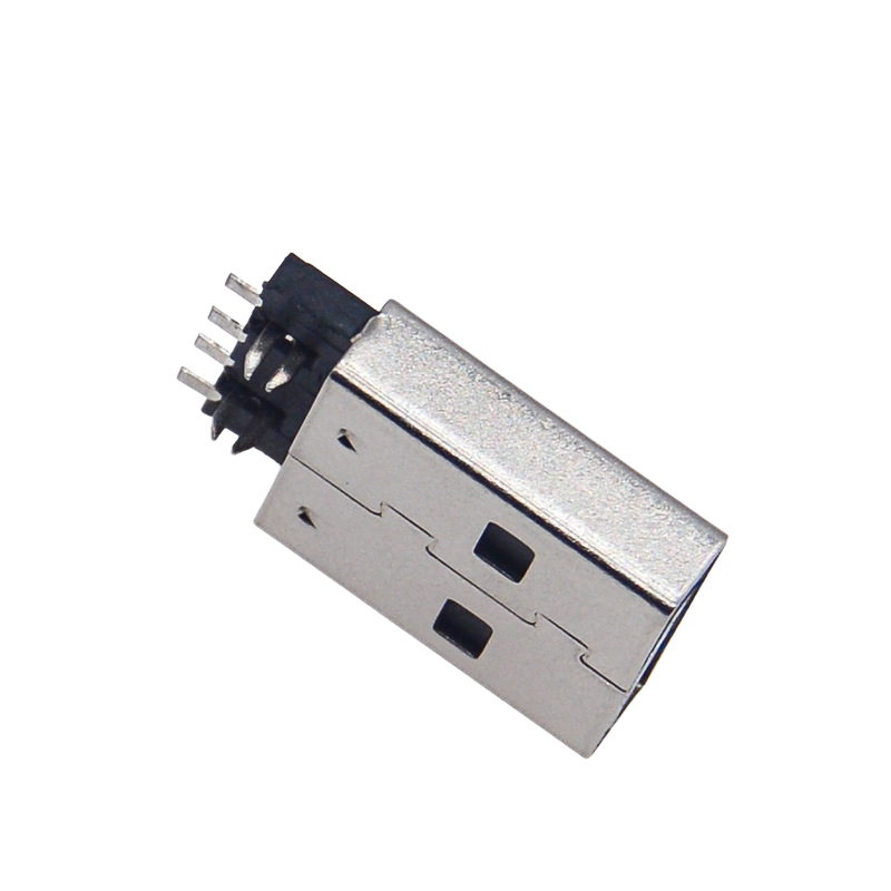Conector USB 2.0 Tipo-A Macho, Montaje Vertical SMT con Patas de Bloqueo Tipo Arpón, Carcasa de Nailon Negra