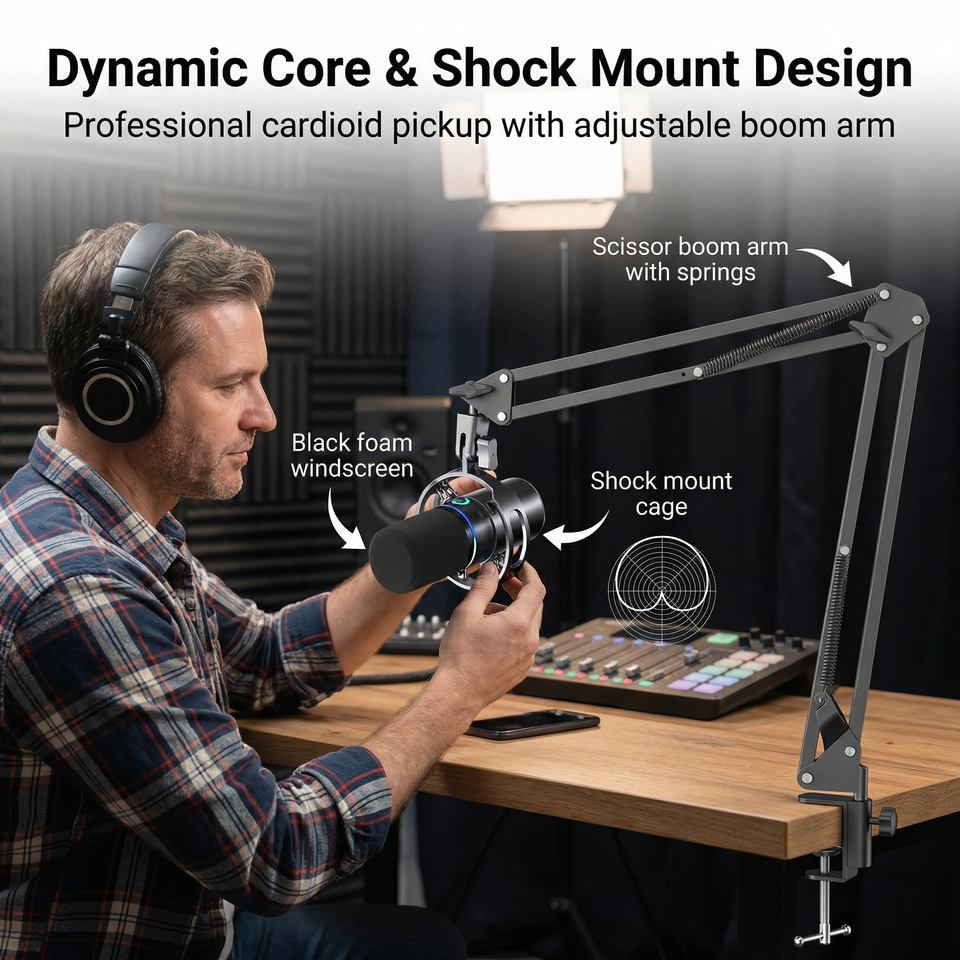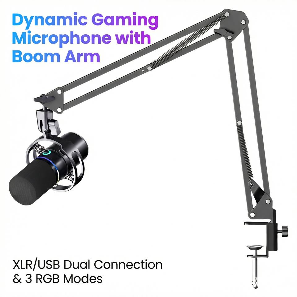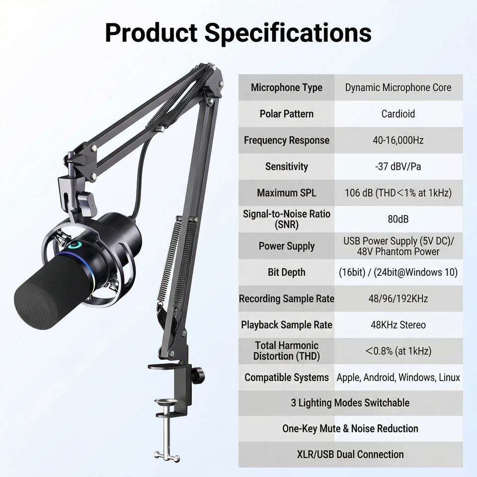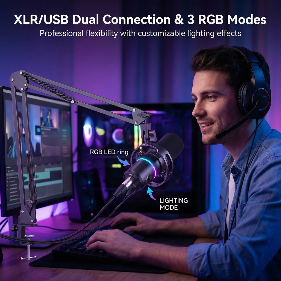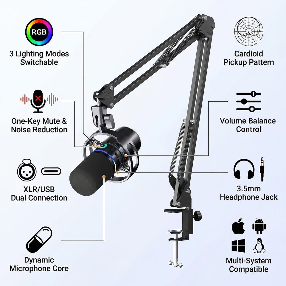 Micrófono de Condensador USB/TIPO-C, Micrófono para Computadora, Cableado, 3 Modos de Iluminación, Silenciador de un Toque, Control de Volumen con Reducción de Ruido